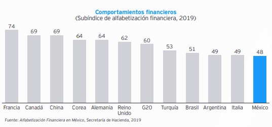 Pero, a pesar de la penetración digital en México, el país aún tiene importantes áreas de oportunidad. Y es que es considerado el peor calificado, dentro del grupo G20, en cuanto a temas de educación financiera dentro de tres categorías: control financiero (uso de presupuesto y planeación financiera), resiliencia financiera (ahorro activo) y toma informada de decisiones (Gráfico 1).