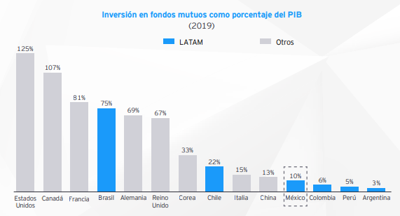 Adicionalmente, existen otros factores que revelan el rezago financiero en México, destacando la poca cultura de inversión y la aversión al riesgo. Información del Banco Mundial revela que en nuestro país los activos invertidos en fondos mutuos representaban solo el 10% del PIB en el 2019 y, de los pocos mexicanos que están dispuestos a invertir (2%), la mayoría son muy conservadores, prefiriendo los instrumentos de deuda (67%) sobre los de renta variable.