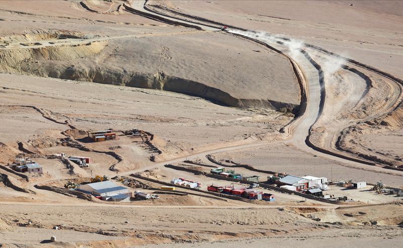 Geólogos clasifican muestras recién extraídas, mientras máquinas avanzan por accidentados caminos montañosos hacia el campamento Batidero, con capacidad para alojar a más de 1.000 trabajadores, en una zona árida donde conviven zorros y vicuñas.