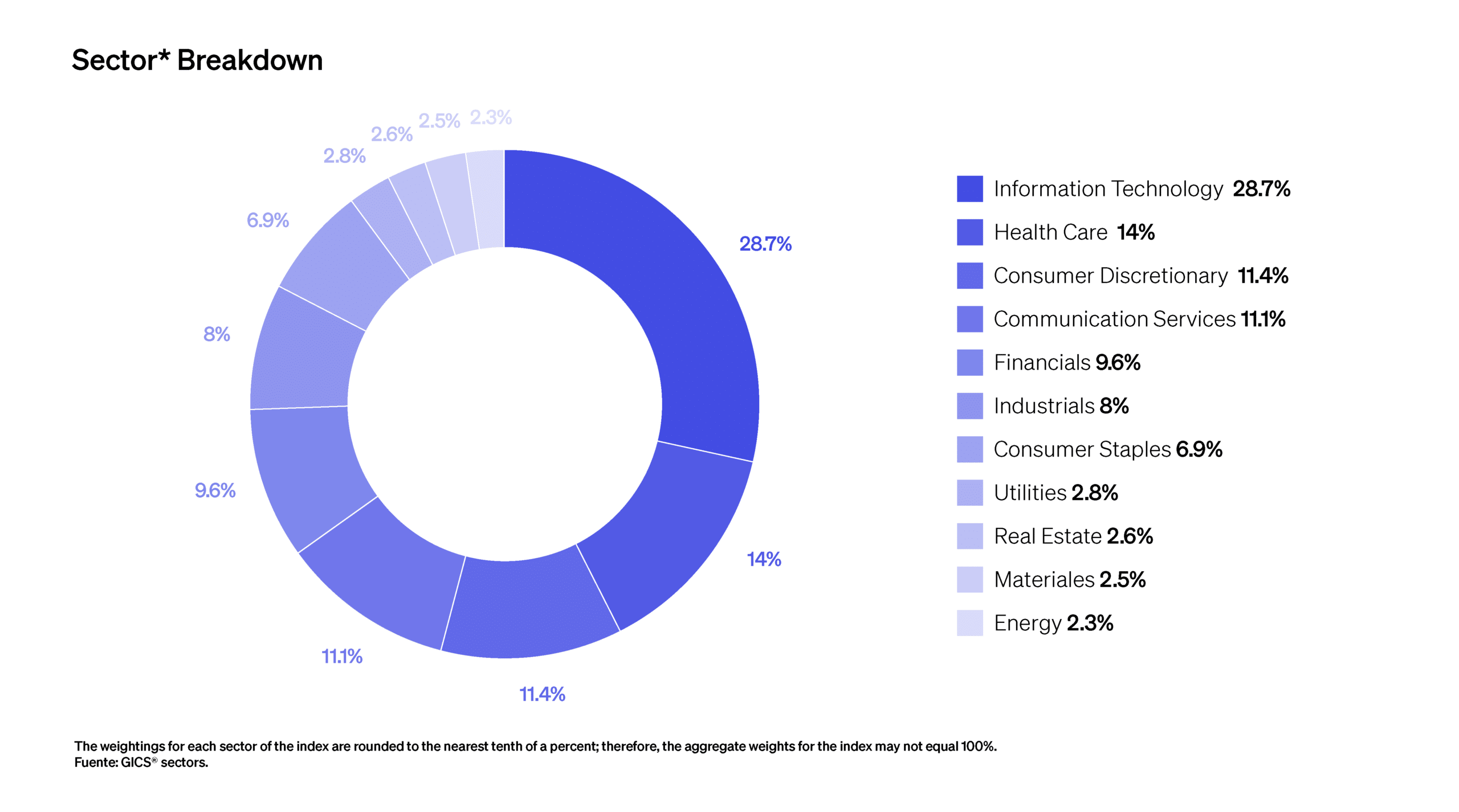En segundo lugar, el sector Salud con un 14 % dentro del índice. En tercer lugar, Consumo Discrecional con un 11.4 %.