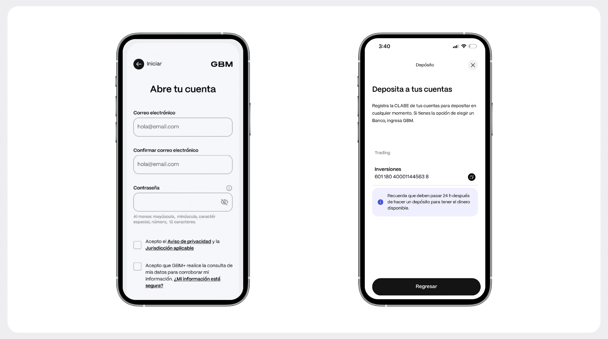 Para operar con GBM, simplemente deposita dinero en tu cuenta desde la aplicación móvil o la aplicación web.