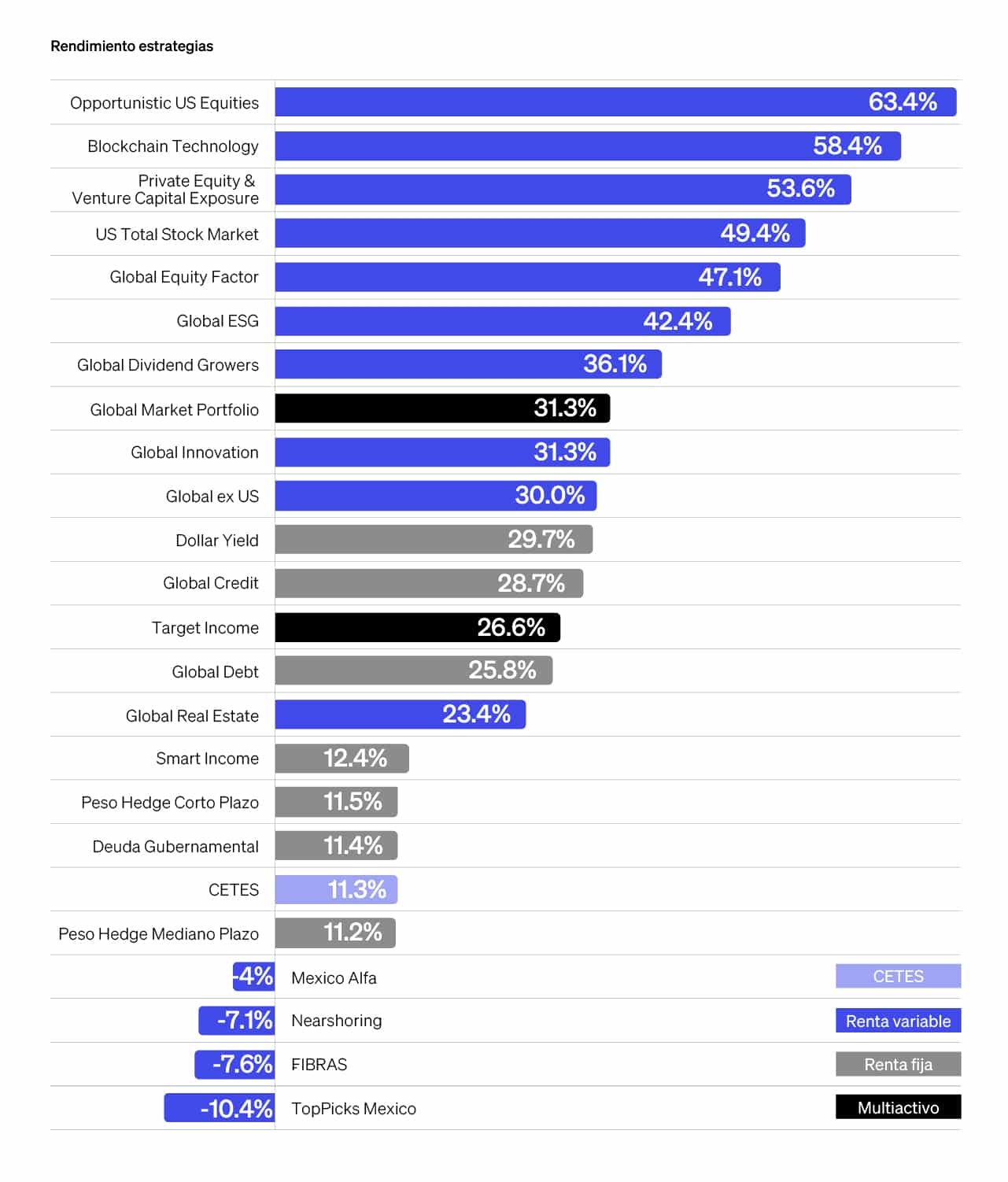 En 2024, GBM demostró una gestión excepcional en sus Cuentas Gestionadas, obteniendo rendimientos sobresalientes en varias estrategias. Aquí algunos de los resultados más relevantes (en porcentajes de rendimiento bruto en pesos mexicanos):