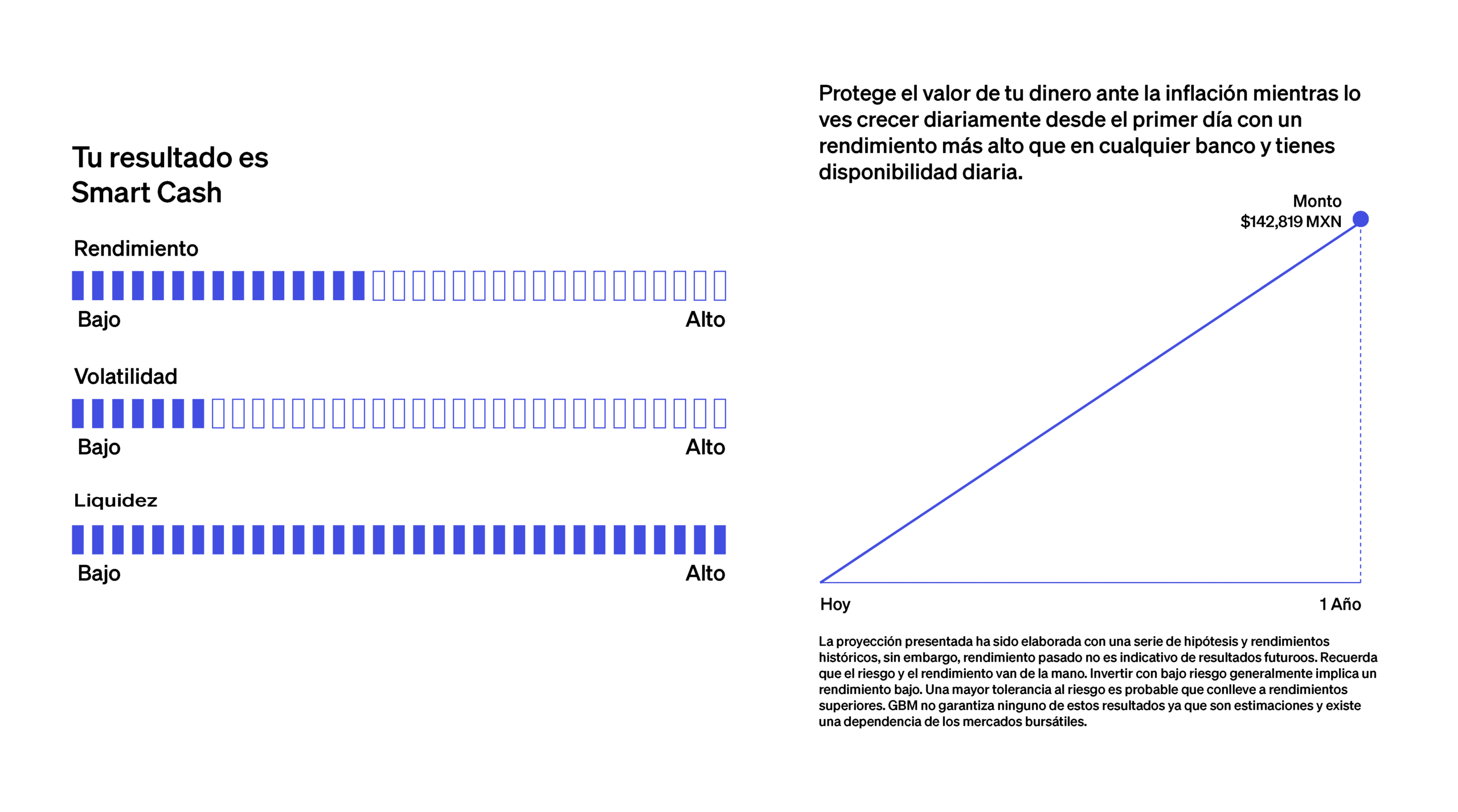 Si buscas crear una estrategia para alcanzar algún objetivo específico como ahorrar para una casa, invertir para tu retiro, ahorrar para una maestría , un gasto mayor, o simplemente aumentar tu patrimonio, selecciona como objetivo en nuestro simulador de inversiones: Gasto Importante o Construir mi Patrimonio. Ambas opciones te llevarán a crear una estrategia en Asesoría+, donde nuestros expertos construirán un portafolio diseñado de acuerdo con tus preferencias de inversión.