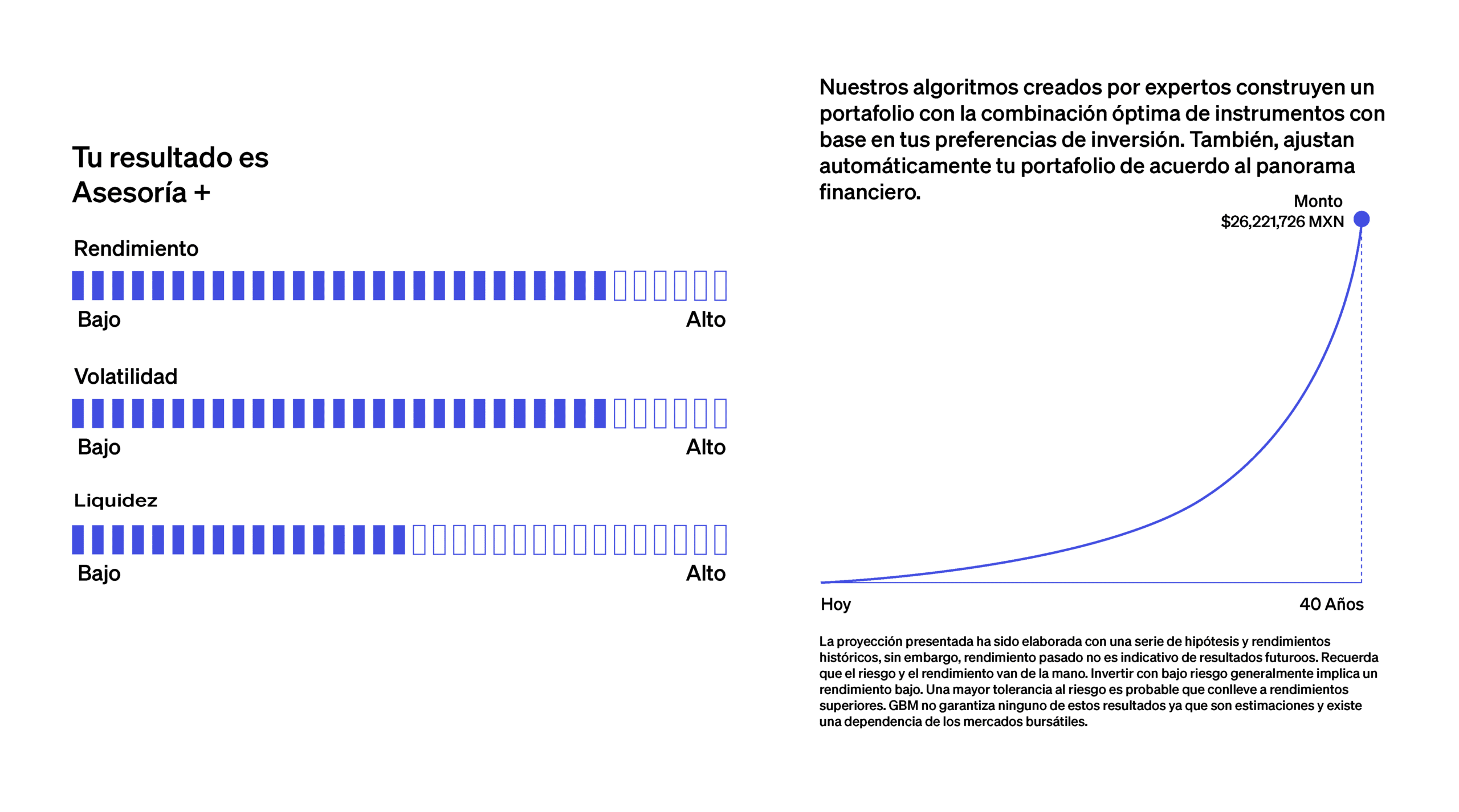 Una vez que ingreses esta información, descubrirás qué alternativa te ofrece el mejor rendimiento. Nuestro algoritmo, creado por expertos, simula el desempeño de las inversiones más convenientes para ti, teniendo en cuenta el plazo y los montos de inversión que hayas establecido.