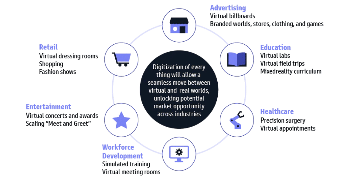 La mayoría de las áreas en las que hoy en día invertimos y que aportan a la economía, son aquellas que estarían presentes de igual manera en el metaverso, desde el retail a través de la venta, y creación de vestimenta; la industria del entretenimiento con conciertos virtuales o Meet & Greets; en el área laboral con entrenamientos y onboardings virtuales; la educación por medio de laboratorios y excursiones virtuales; publicidad virtual, juegos e incluso hasta para el desarrollo de la salud, con citas virtuales.