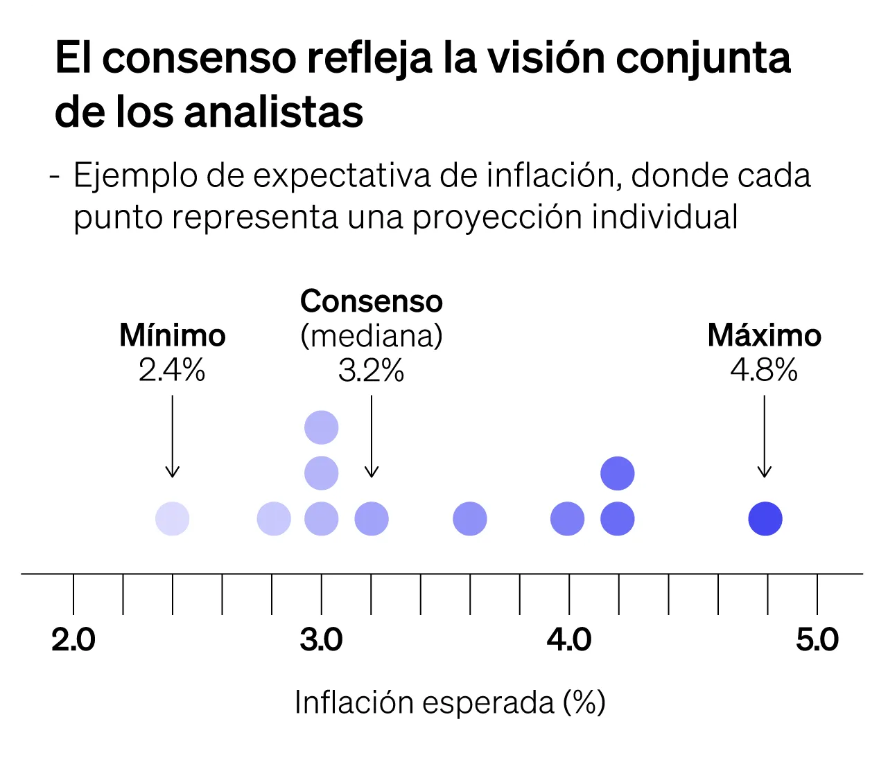 Además del consenso, las encuestas incluyen otras métricas, como la proyección más alta y más baja, para tener una idea de las expectativas más optimistas o pesimistas, así como qué tan dispersas son las respuestas. Aunque cada encuesta tiene lo suyo, lo importante no es el tecnicismo, sino saber si los expertos están relativamente de acuerdo… o si cada uno ve un panorama distinto.