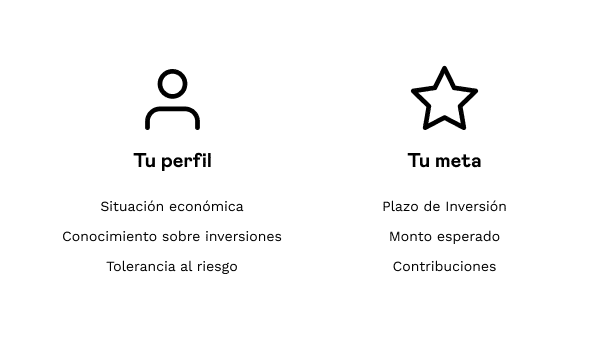 - Primero tienes que dar clic en "Crear meta" y llegarás a nuestro perfilador donde encontrarás una serie de preguntas que diseñamos para ti. ¡No te preocupes! Las respuestas las usaremos únicamente para encontrar el portafolio ideal para lograr tu meta y no las compartiremos con nadie.