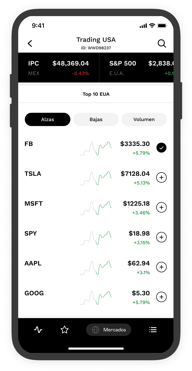 Con GBM, tienes la posibilidad de invertir en empresas locales y extranjeras a través del Sistema Internacional de Cotizaciones. Asimismo, puedes invertir en fracciones de acciones a partir de MXN $20 directamente en el mercado estadounidense, gracias a Trading Global de GBM.
