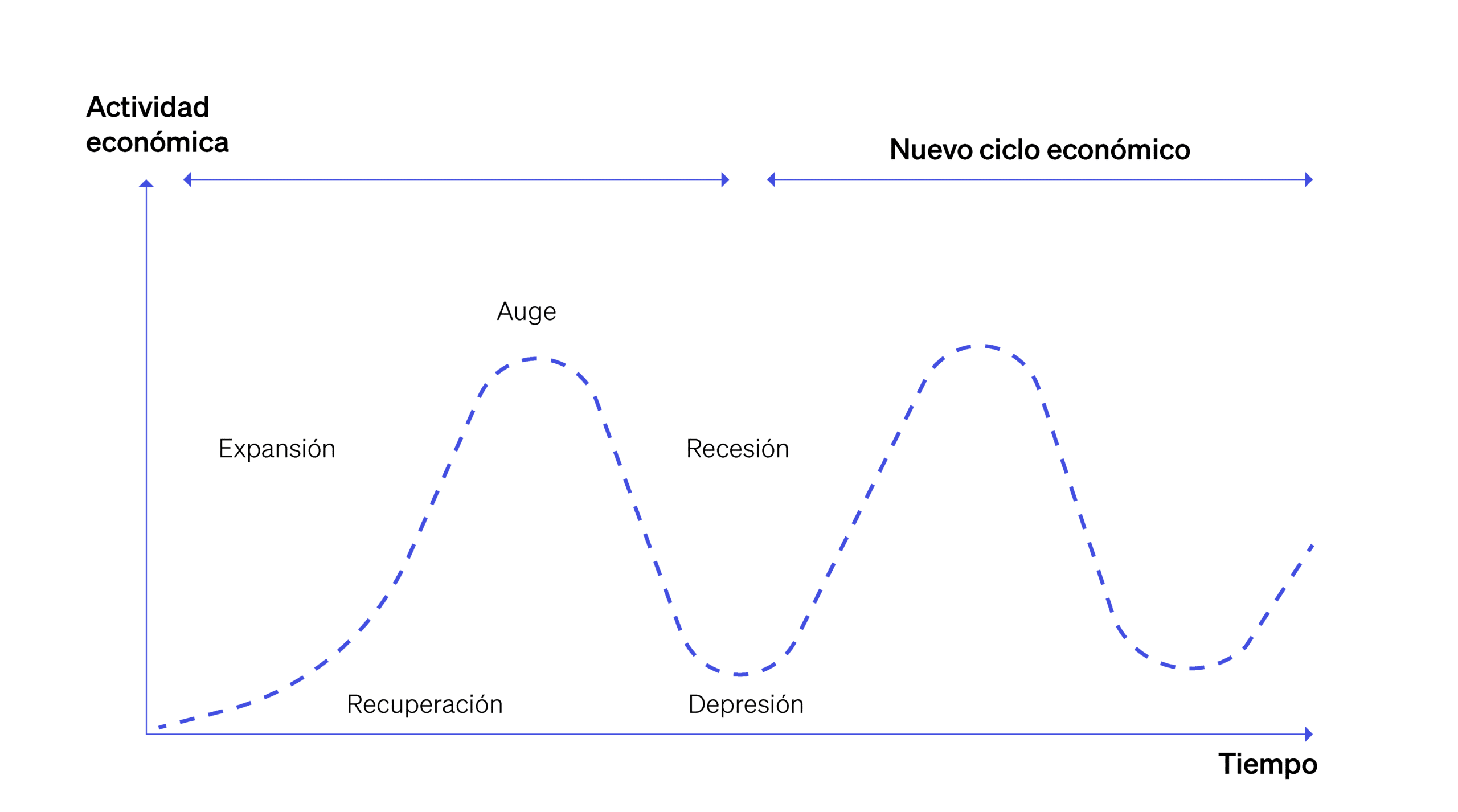 Se le conoce como ciclo económico al estado de fluctuaciones a lo largo del tiempo de la actividad económica la cuál atraviesa cinco fases (expansión, auge, recesión, depresión, y recuperación).
