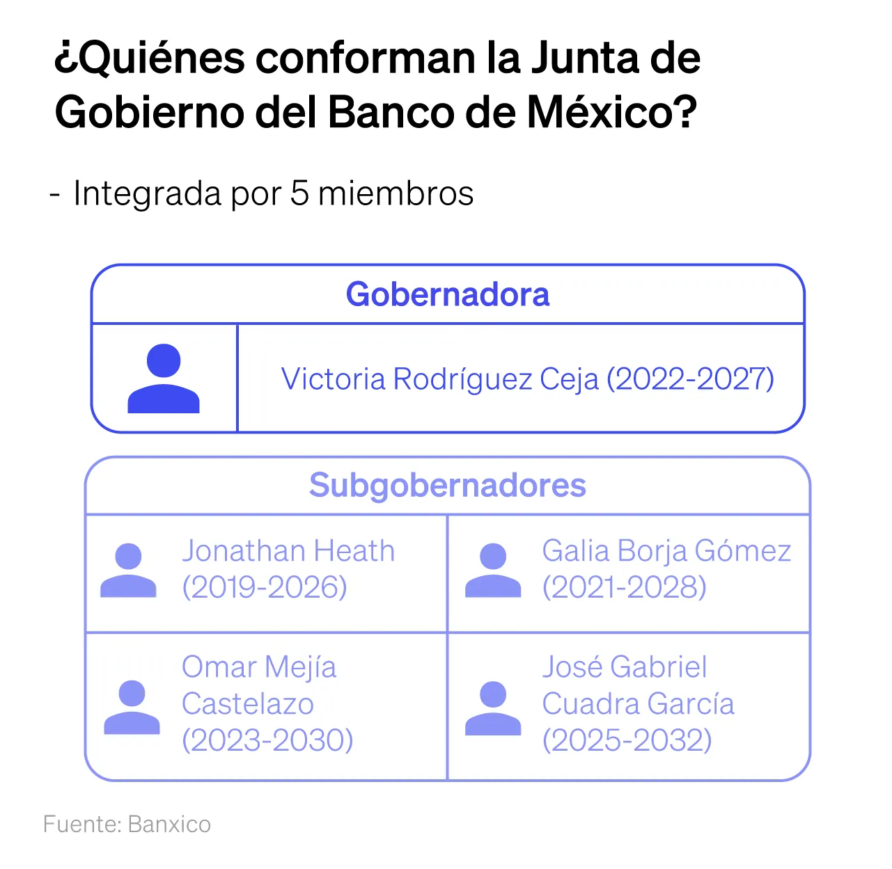 Esa autonomía se refleja también en su estructura. Las decisiones no recaen en una sola persona, sino en la Junta de Gobierno, integrada por una gobernadora o gobernador y cuatro subgobernadores. Todos son propuestos por el o la presidente del país y deben ser ratificados por el Senado, pero una vez en funciones tienen plena independencia. Además, sus periodos son largos —seis años para la persona que encabeza la Junta y ocho para los subgobernadores— para así garantizar continuidad y evitar que los cambios políticos de cada sexenio influyan en las decisiones del banco central.