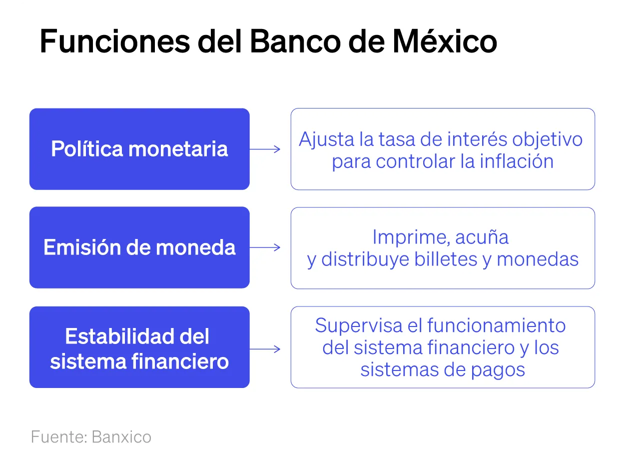El Banco de México, o Banxico, es el banco central del país. Es decir, es la institución encargada de preservar la estabilidad del poder adquisitivo del peso mexicano. Y aunque ese objetivo se resume en controlar la inflación para que el peso no pierda valor, también requiere cumplir con varias tareas adicionales. Entre ellas, Banxico es el responsable de la política monetaria, de poner en circulación los billetes y monedas, y de vigilar que el sistema financiero opere de forma eficiente y ordenada.
