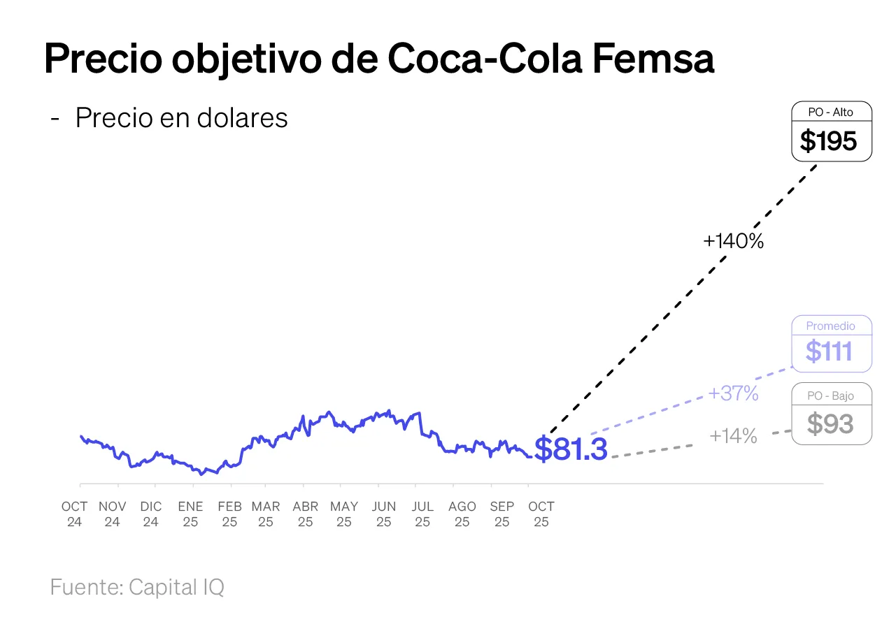 Actualmente, las acciones de KOF cotizan en USD 81.2 con un precio objetivo de USD 111, lo que implica un upside potencial de 37%. Además, la empresa ofrece un dividend yield cercano al 2%.