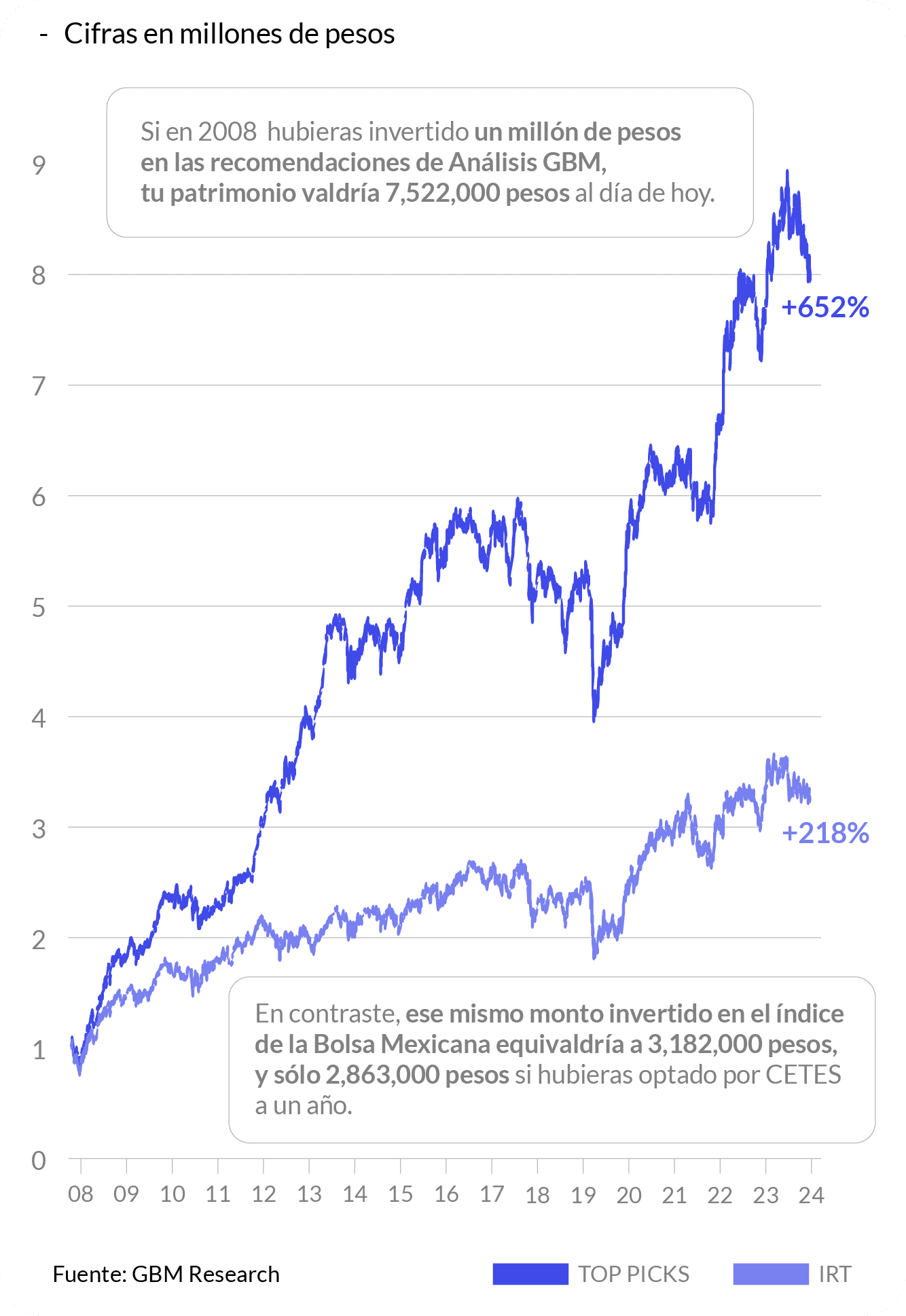 A lo largo de los años, nuestros top picks han consolidado un desempeño sobresaliente y han superado el rendimiento de la bolsa mexicana en promedio por un 6% anual.