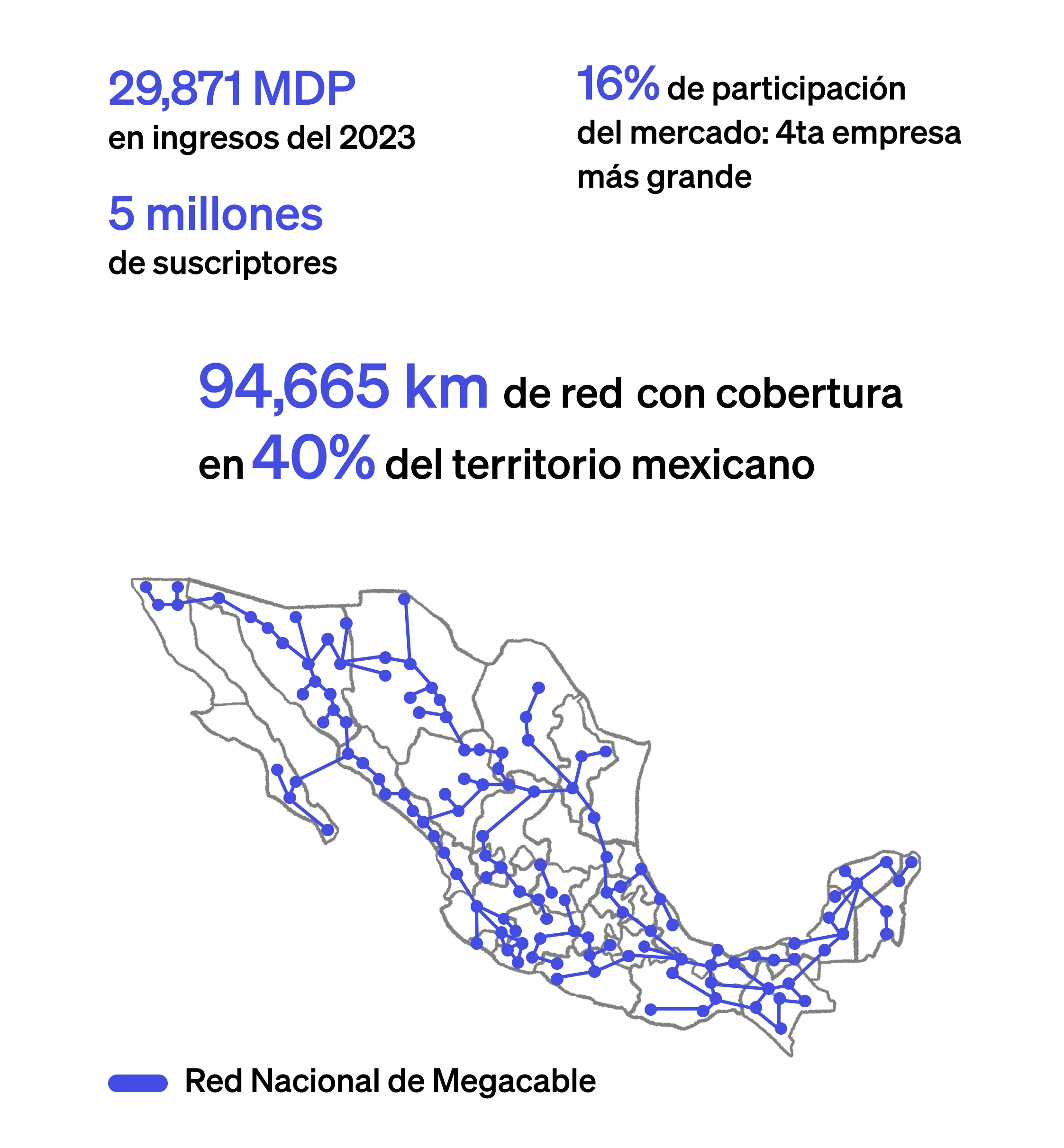 MEGA es una de las empresas más grandes de telecomunicaciones en México, que ofrece servicios de internet, televisión de paga y telefonía. La empresa se listó en la Bolsa Mexicana de Valores en 2007 y, desde entonces, ha pasado de ser un proveedor regional a tener presencia en todo el país. Sus 94,000 kilómetros de red podrían darle dos vueltas a la Tierra.