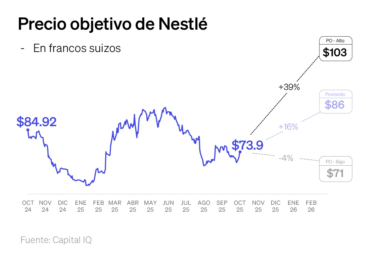 Hoy NESN cotiza a un múltiplo de 17x P/E FWD, lo que implica un descuento frente a su promedio histórico de 10 años (25x) y también frente a sus pares europeos en alimentos y productos de cuidado personal (≈10% de descuento). Al precio actual de CHF 73.8, los analistas le asignan un precio objetivo de CHF 86, lo que representa un potencial de apreciación de 16%. La acción podría ser una apuesta contraria al consenso, ya que el consenso está dividido y los tres principales analistas la tienen en “neutral” o “hold”, a pesar de que los múltiplos sugieren un punto de entrada atractivo.