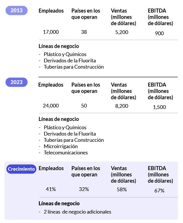 Antes llamada Mexichem, ORBIA es una compañía mexicana que se ha expandido de manera importante durante los últimos diez años a través de una estrategia de crecimiento inorgánico. Para ponerlo en perspectiva, aquí te dejamos unas métricas relevantes que demuestran el crecimiento que la empresa ha experimentado en esta década: