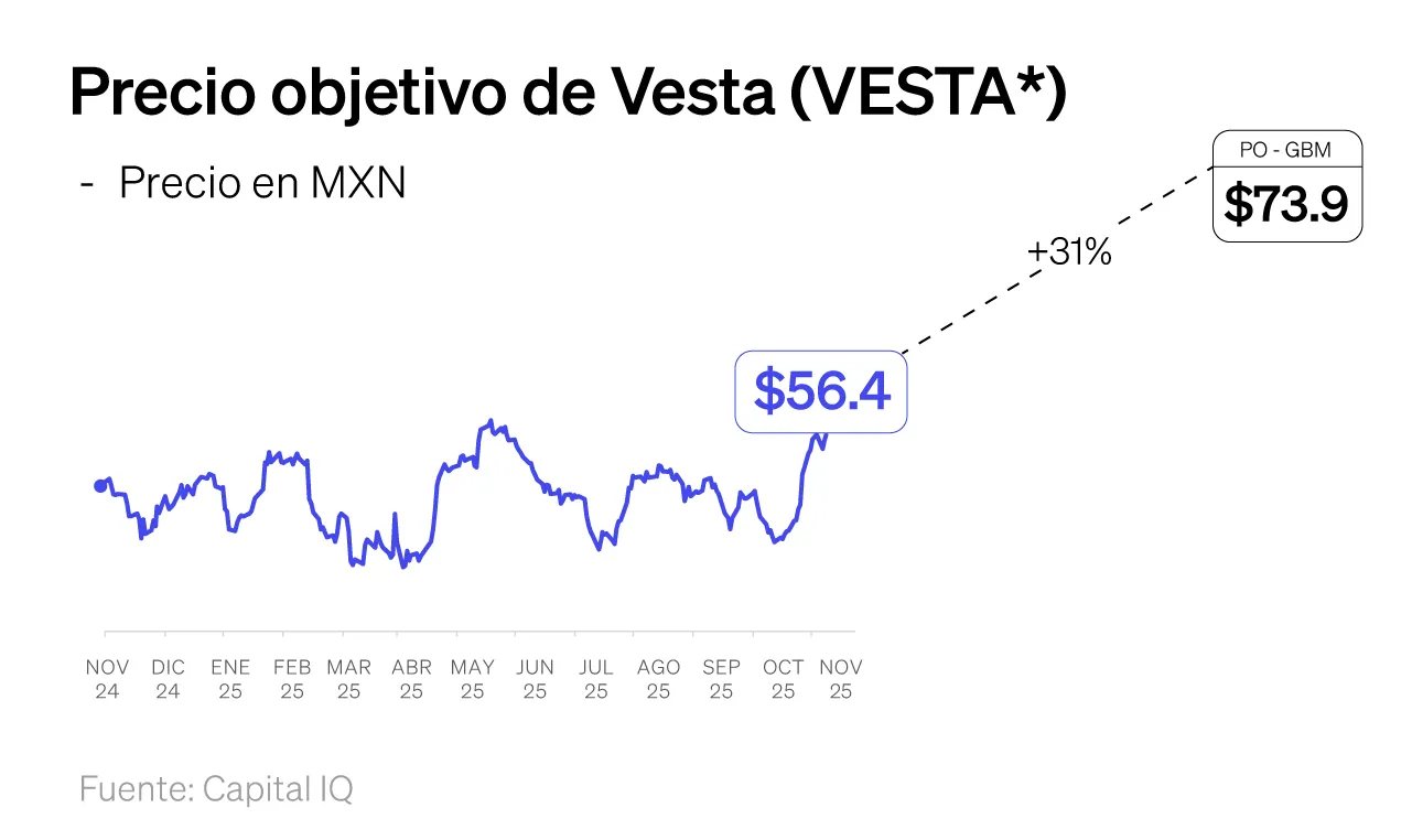 Vesta (VESTA) es uno de los desarrolladores y operadores industriales más importantes de México, enfocado en parques industriales y naves logísticas clase A, con presencia en 16 estados y un portafolio superior a 230 propiedades. Su modelo verticalmente integrado —que abarca diseño, construcción, arrendamiento, gestión y administración— le permite capturar valor en todas las etapas del ciclo inmobiliario y ofrecer soluciones personalizadas a clientes globales como Amazon, BMW, 3M y Nestlé.