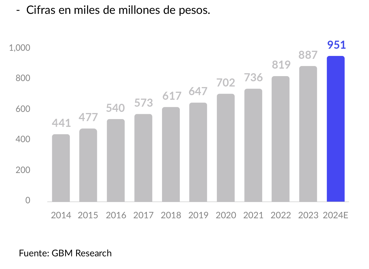 WALMEX ha demostrado un crecimiento sostenible al paso de los años. Prueba de ello es que la empresa logró duplicar sus ventas en los últimos nueve años, logrando un crecimiento anual compuesto de 8.1% y manteniendo al mismo tiempo altos niveles de rentabilidad. Además de las aperturas de tiendas, lo anterior se explica en gran medida por una mejoría en las ventas por tienda, lograda a través de eficiencias como optimización de inventarios, mejora de red logística, crecimiento de su negocio comercio electrónico e inversiones para mantener precios bajos de sus productos, lo cual deberá de seguir impulsando un crecimiento atractivo a futuro.