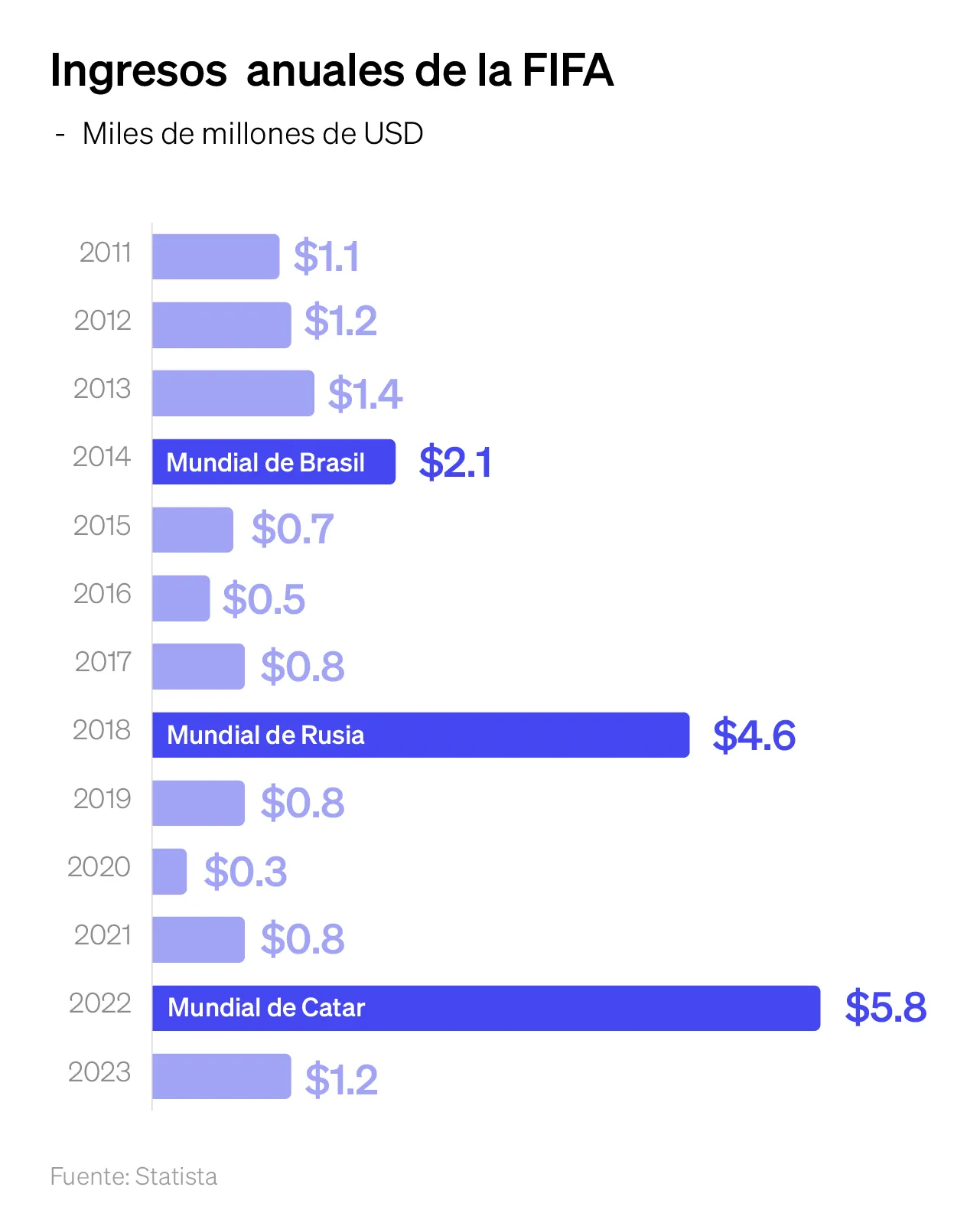 Para la FIFA, el Mundial representa su principal fuente de ingresos. Como muestra el caso de Catar 2022, la venta de derechos relacionados con el torneo generó $6,300 millones de dólares entre 2019 y 2022, lo que equivale al 83% de los ingresos totales de la organización en ese ciclo. Este impacto financiero convierte a cada Copa del Mundo en un evento crucial para la sostenibilidad y expansión de las operaciones de la FIFA a nivel global.