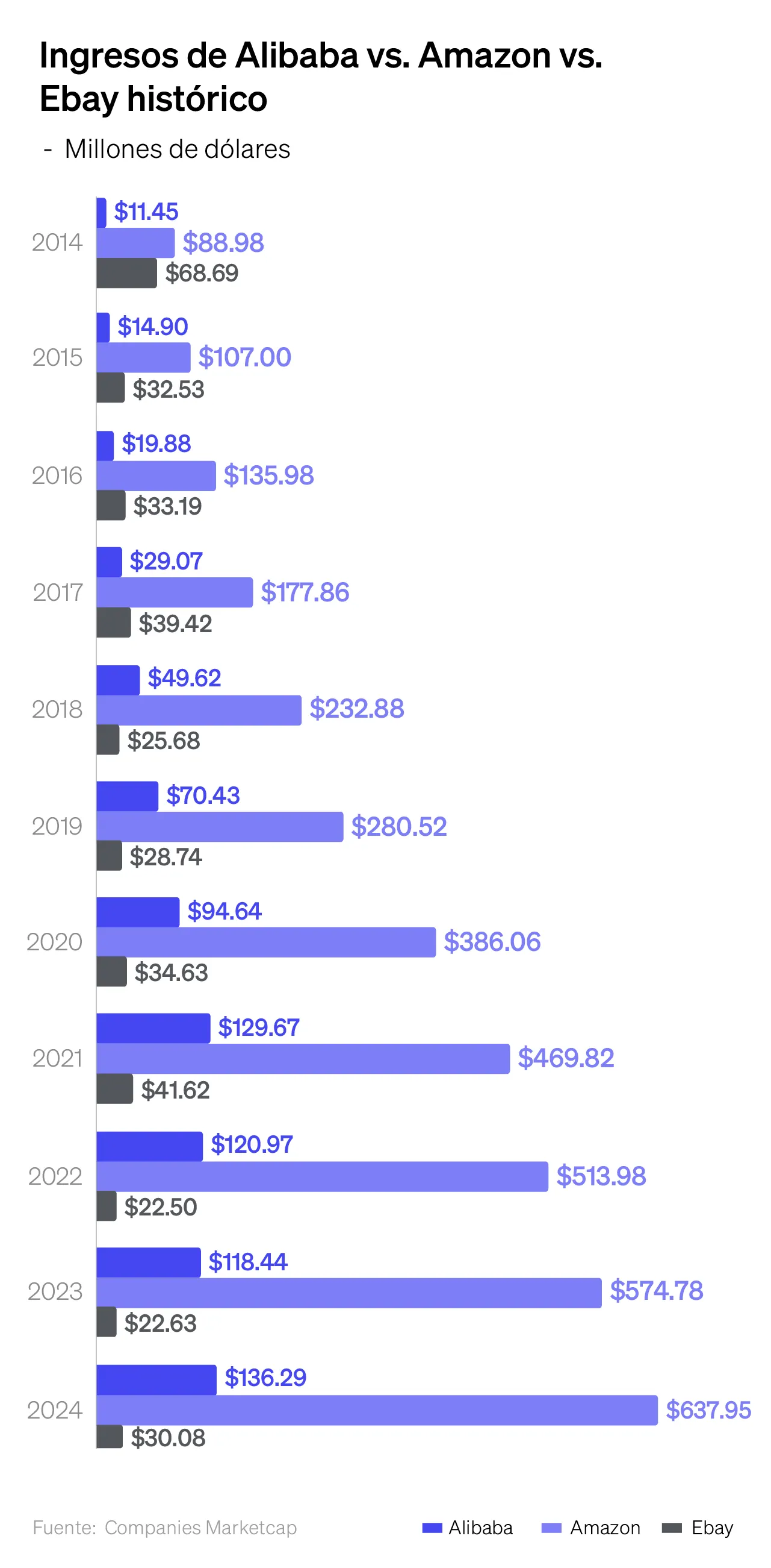 En su mejor año fiscal, Alibaba superó los $136,000 millones de dólares en ingresos, una cifra comparable con gigantes como Amazon (que en ese mismo año facturó $637,000 millones) pero muy por encima de jugadores como eBay, que generó apenas $30,000 millones. Aunque aún lejos del tamaño de Amazon en términos de ingresos, Alibaba domina con claridad el mercado digital chino y representa un modelo único de empresa integrada y adaptada a las condiciones de su país.