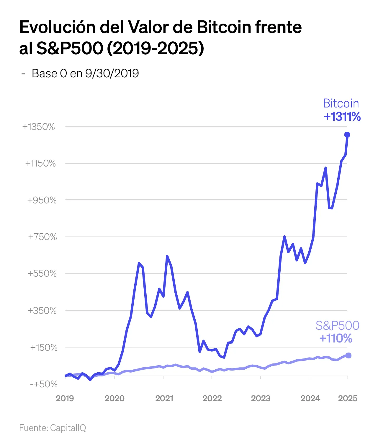 En 2010, 10,000 bitcoins compraban dos pizzas. Hoy, esa misma cantidad vale más de $1.2 mil millones de dólares. Bitcoin ha sido el activo con mejor rendimiento de la última década, superando por amplio margen al S&P 500, el oro y las grandes tecnológicas.