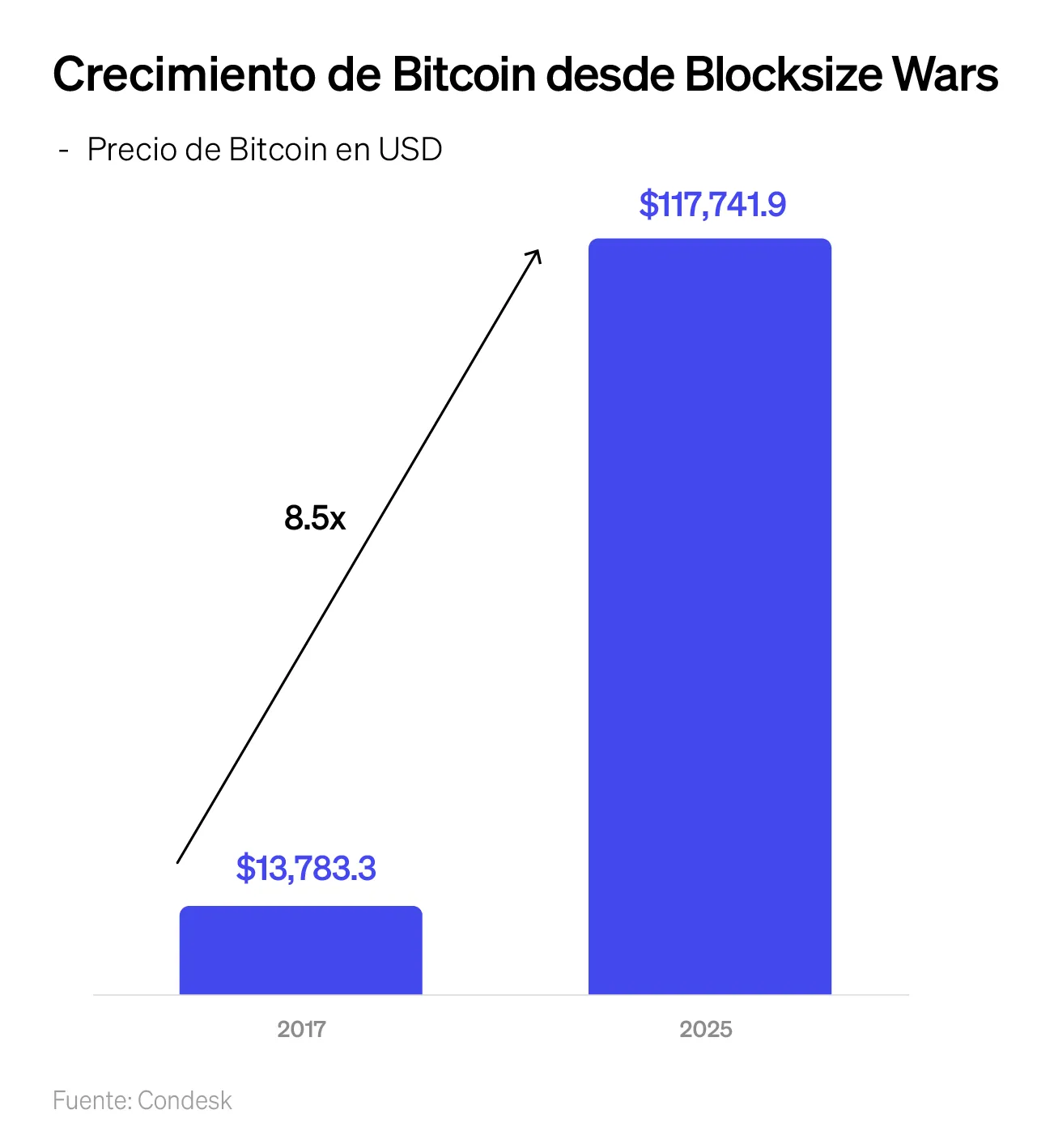 Tras la Blocksize War y la bifurcación de 2017, la adopción institucional de Bitcoin ha crecido y su valor se ha multiplicado por más de 8.5 veces. A pesar de la competencia, ninguna otra criptomoneda ha logrado construir una percepción tan sólida de descentralización, escasez y resiliencia. Para muchos inversionistas, esa coherencia en momentos críticos es lo que justifica