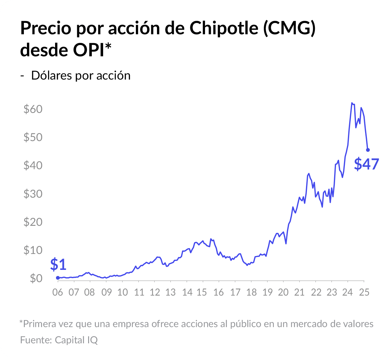 Para el 2026, Chipotle pisará México de la mano de Alsea, empresa que cotiza en la Bolsa Mexicana de Valores bajo el ticker ALSEA. Como parte de un programa de expansión en la región de Latinoamérica, la cadena, reconocida por su sazón mexicano, está quizás haciendo una apuesta arriesgada al llegar a la región que define su cocina. Considerando agregar más salsa a sus platillos, si Chipotle llega con su actual precio promedio por ticket de $18 dólares, competirá con restaurantes de comida rápida de alta gama como Shake Shack, cuyos precios promedio por ticket fluctúan entre los $150 y $200 pesos.