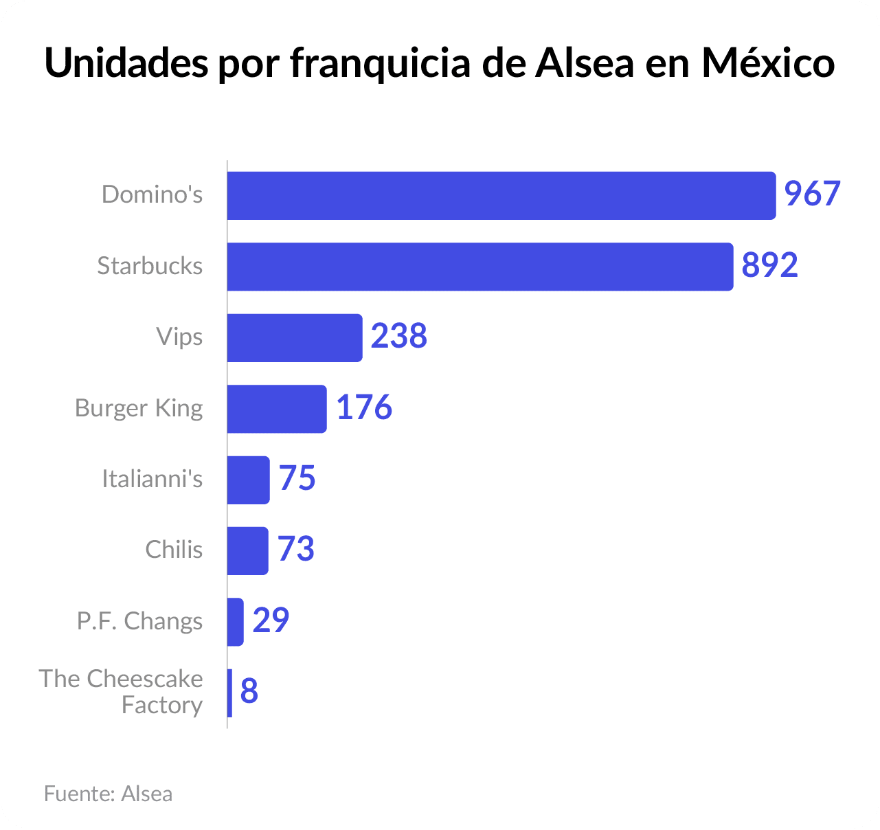 Alsea ha demostrado tener éxito operando cadenas extranjeras en el país. Entre las marcas que maneja se encuentran: Domino’s, Starbucks, Burger King, Chili’s, P.F. Chang’s, Italianni’s y The Cheesecake Factory, además de operar la exitosa cadena mexicana Vips. A finales del 2024, Alsea manejaba 2,458 restaurantes en México.
