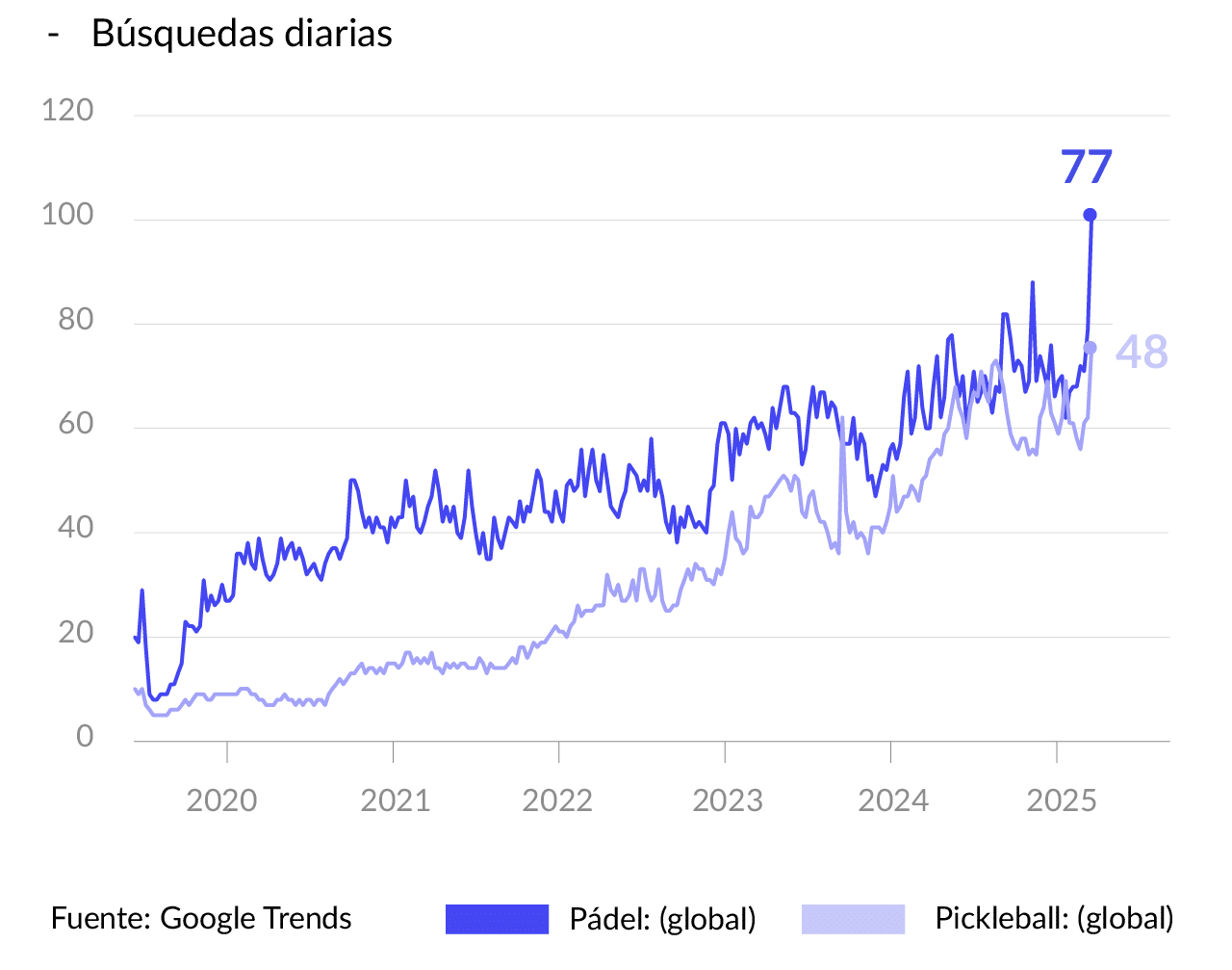 Interés de búsqueda global diaria a través de Google de los términos de “pádel” vs. “pickleball”