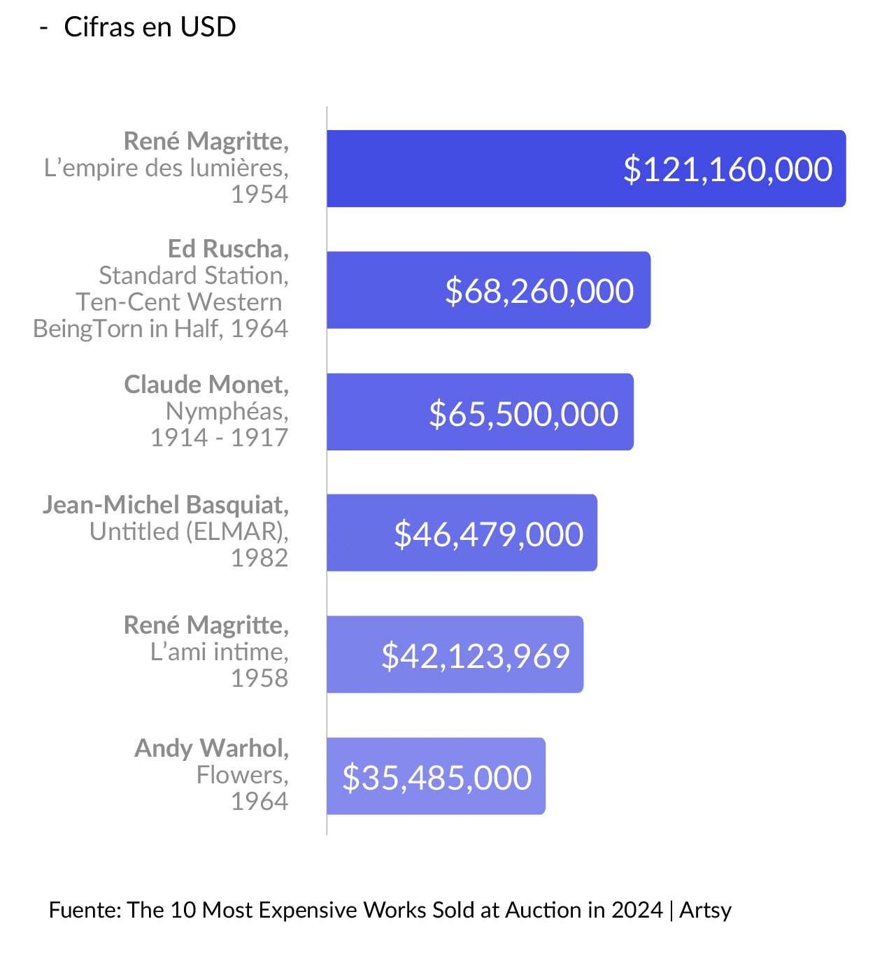 Aunque el arte contemporáneo va en auge, el arte moderno sigue dominando las obras más caras del mercado. En este contexto, el año 2024 marcó un récord con la venta de "L'empire des lumières" de René Magritte por $121.16 millones de dólares, destacada como la obra más cara subastada en el año, según Artsy. Esta transacción refleja cómo el mercado especulativo del arte permanece reservado para un grupo exclusivo de individuos de alto poder adquisitivo, quienes ven estas adquisiciones no sólo como inversiones, sino también como símbolos de poder y prestigio. Este nicho destaca la dualidad del arte como un activo cultural y un instrumento financiero.