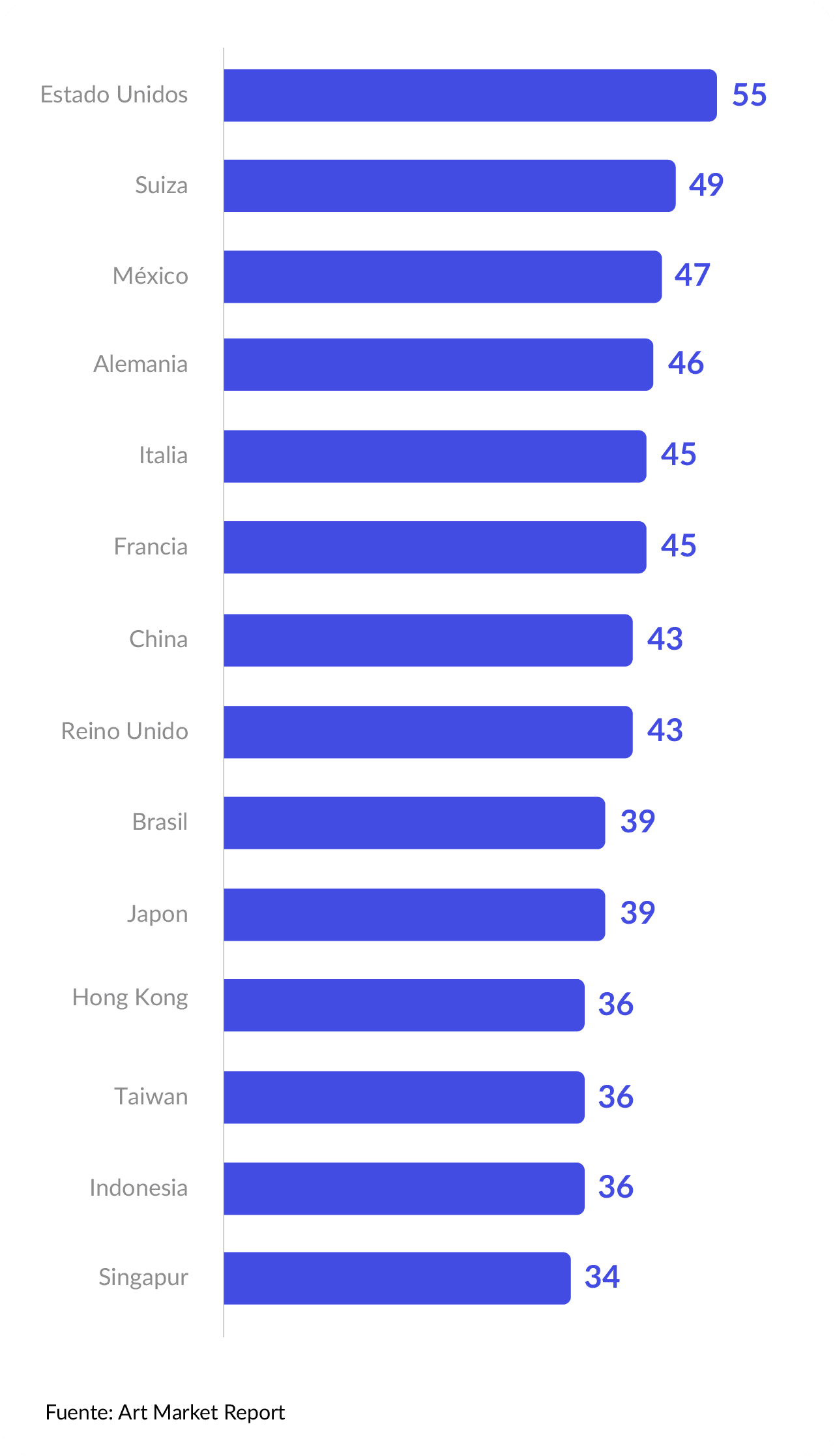 El mercado del arte global se encuentra altamente concentrado en ciertos países que dominan las transacciones de alto valor y el comercio cultural. Estados Unidos, por ejemplo, concentra una porción significativa del mercado global del arte gracias a las colecciones de individuos con alto poder adquisitivo, tanto por la ubicación de casas de subastas icónicas como Sotheby’s y Christie’s, como por el papel de ciudades como Nueva York, considerada el epicentro del arte contemporáneo. México, por su lado, tiene un importante lugar en el marco internacional, concentrando un significativo número de obras de arte en las colecciones privadas. La Colección Jumex y la Colección Coppel son dos de las más importantes.