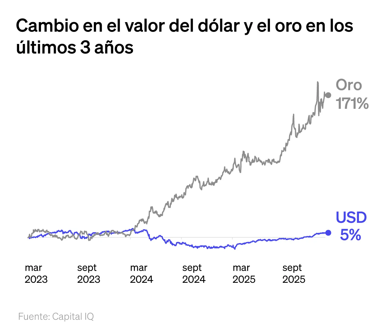 Ese acto, conocido como el “Nixon Shock”, marcó el fin del sistema de Bretton Woods y, en la práctica, del patrón oro internacional. Para 1976, el vínculo formal entre el dólar y el oro había desaparecido por completo. El mundo entraba en la era del dinero fiat, donde el valor de la moneda ya no se captura en un metal, sino en la credibilidad institucional del Estado. Desde entonces, la relación entre el oro y el dólar ha sido estructuralmente inversa en el largo plazo: cuando el poder adquisitivo del dólar se erosiona, el oro tiende a apreciarse como reserva de valor. No siempre ocurre de forma inmediata, pero históricamente el metal ha funcionado como termómetro de confianza monetaria.