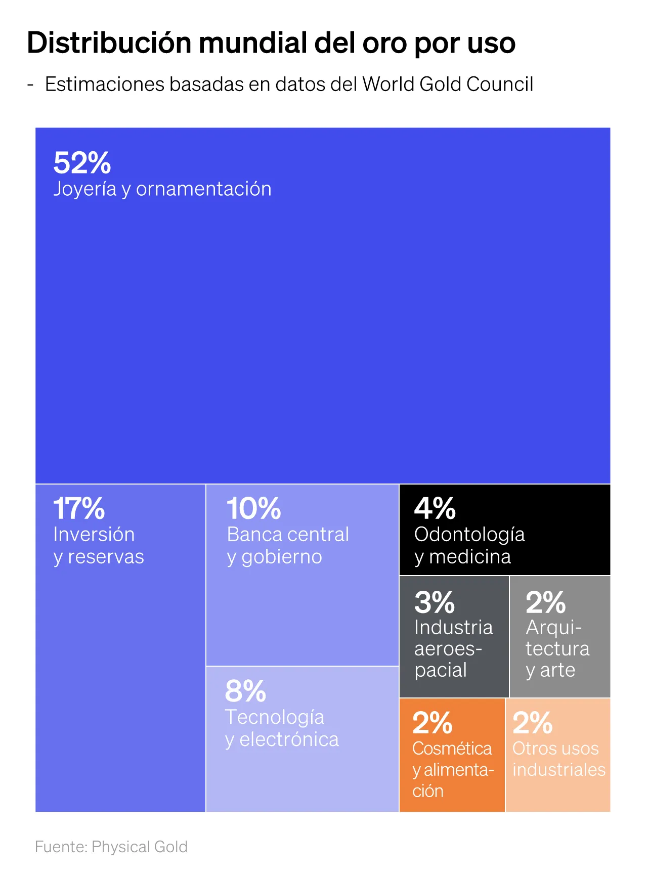 Aproximadamente el 52% del oro extraído en el mundo termina convertido en joyería. India y China lideran este consumo, impulsados por tradiciones donde el oro funciona como ornamento y como ahorro (y legado) familiar. La razón de su dominio en este segmento se debe a que no se oxida, no se corroe y mantiene su apariencia durante milenios. Un objeto fabricado hace 3,000 años puede conservarse intacto hoy. Esa durabilidad física explica buena parte de su valor cultural, y su popularidad frente a otros metales.