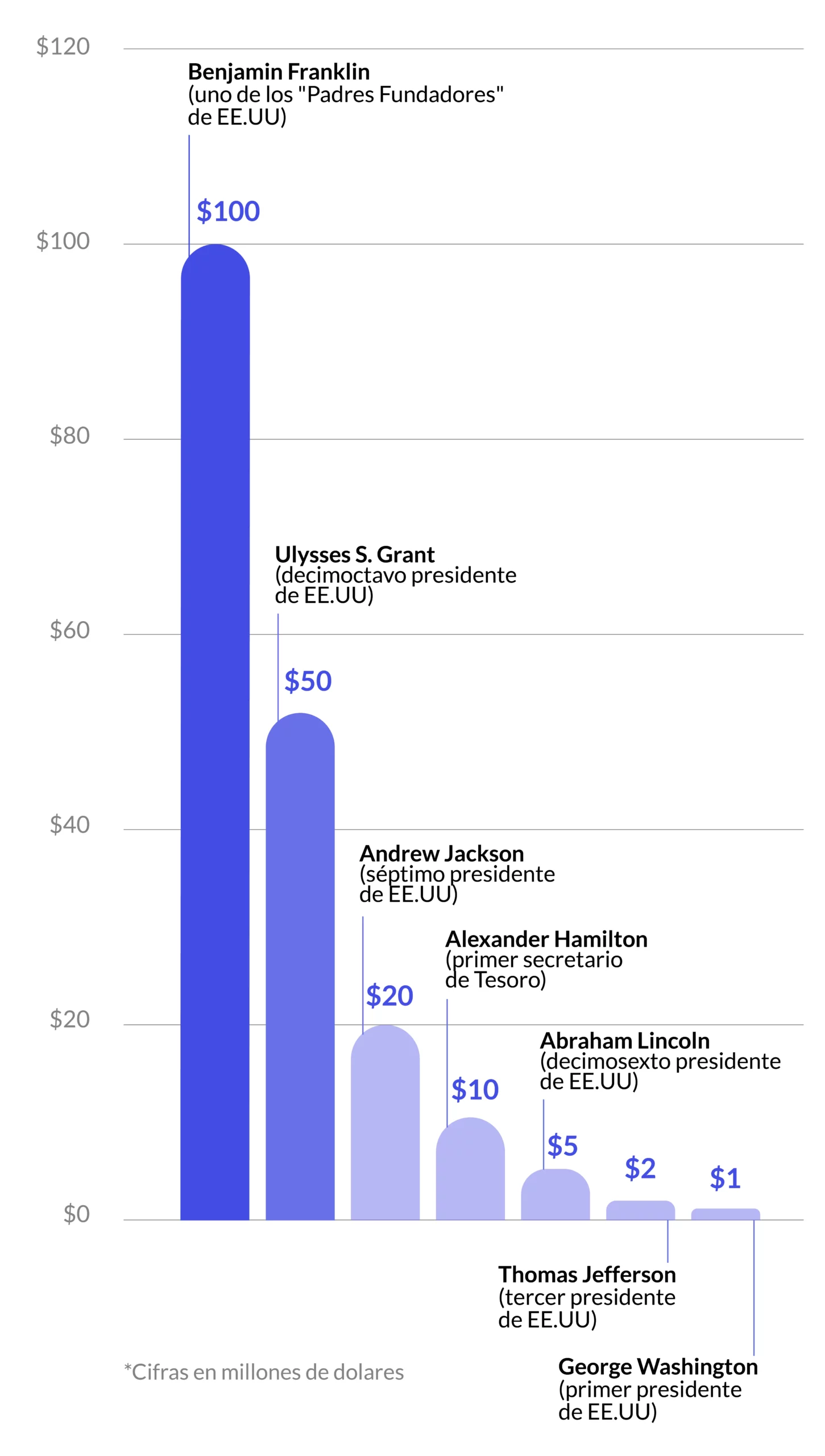 George Washington aparece en el billete de un dólar, Jefferson en el billete de $2 —aunque casi no lo veas en las calles—; Lincoln en el de $5, Alexander Hamilton en el de $10, Andrew Jackson en el de $20, Ulysses S. Grant en el de $50 y Benjamin Franklin en el de $100.