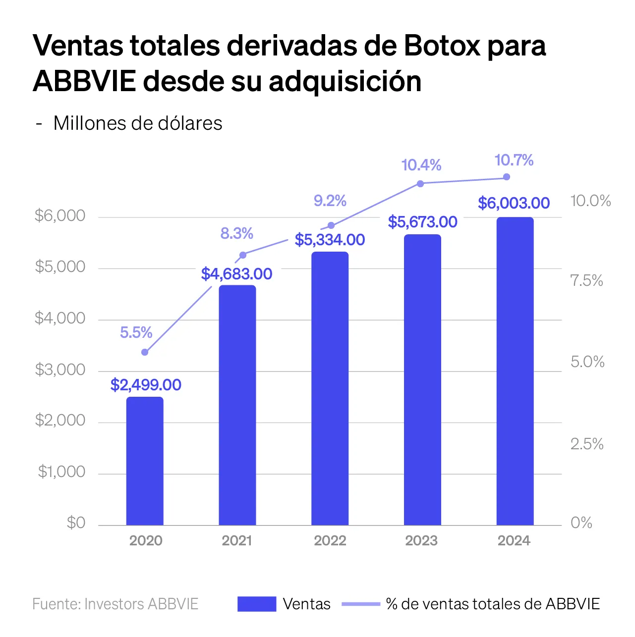 El mercado global del Botox, incluyendo sus versiones estéticas y médicas, superó los $7,000 millones de dólares en 2023. Las proyecciones indican que alcanzará más de $10,000 millones de dólares para el año 2027, impulsado tanto por el envejecimiento de la población como por la creciente demanda entre consumidores jóvenes. Esta industria está liderada por AbbVie, una de las farmacéuticas más grandes del mundo, que adquirió Allergan —la empresa detrás de Botox— por $63,000 millones de dólares en 2020. Esta adquisición no sólo consolidó su dominio en la estética médica, sino que también reforzó su portafolio ante el declive de su medicamento estrella, Humira.