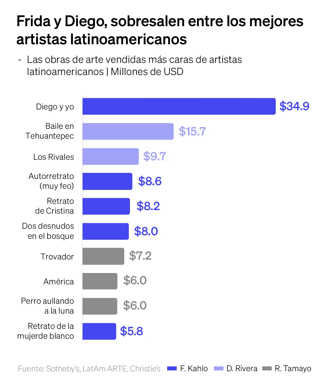 En Christie’s, otra casa de subastas, se han subastado obras de Frida por más de $8 millones de dólares, como El retrato de Cristina, mi hermana o Autorretrato. Muy feo, un fresco que Frida despreció y tiró a la basura, que posteriormente fue rescatada por su amiga Lucienne Bloch, han sido disputados por coleccionistas. Aquellos que ella consideró un fracaso hoy es testimonio de una voz demasiado poderosa para apagarse, incluso en sus dudas.