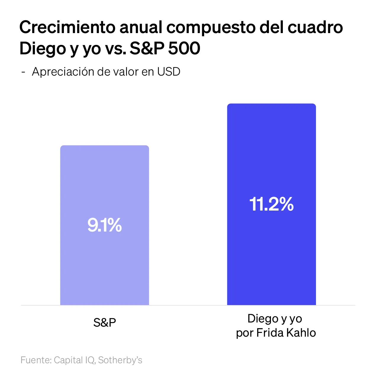 El cuadro de Diego y Yo se vendió por $1.4 millones de dólares en 1990 y por $34.9 en 2021, apreciándose, 2340% a un crecimiento anual compuesto de 11%. Durante ese mismo tiempo, el S&P se apreció a un crecimiento anual compuesto de 9%.