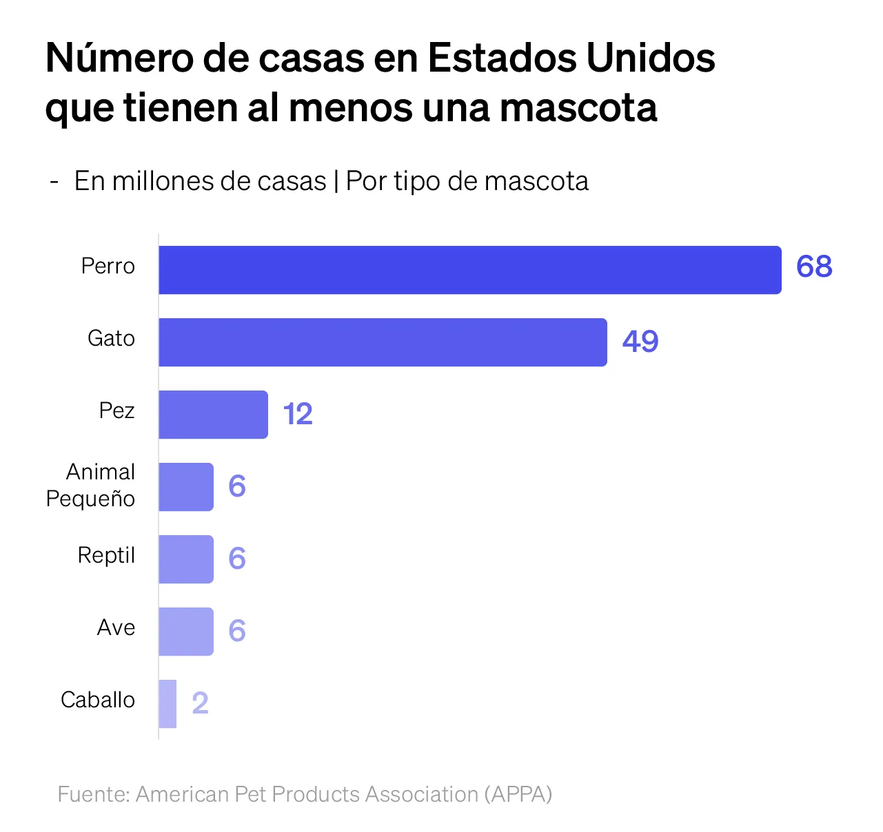 Y si cruzamos la frontera, los datos nos vuelven a decir lo mismo: el 71% de los hogares en Estados Unidos (94 millones de viviendas) tienen una mascota actualmente, frente al 66% en 2024 y al 56% en 1988. Además, el 97% de los dueños considera a su mascota parte de la familia. Este cariño se traduce en una industria que no para de crecer: tan solo en Estados Unidos, se espera que el gasto total en productos y servicios para mascotas alcance $157 mil millones de dólares en 2025. Esto incluye $67.8 mil millones corresponden a alimento, $41.4 mil millones en cuidado veterinario y $34.3 mil millones en suministros y medicina.