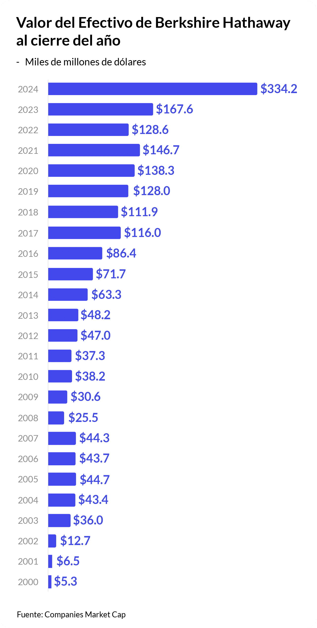 Berkshire Hathaway mantiene una posición de efectivo sin precedentes con más de $334 mil millones de dólares en caja y equivalentes al cierre de 2024. Para la mayoría de las empresas, tener tanto capital sin repartirlo entre accionistas sería motivo de críticas; para Buffett es parte del plan.