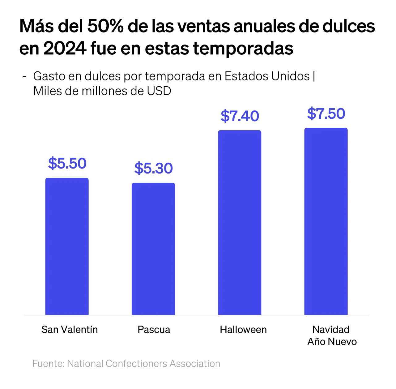 México no se queda atrás. Con un mercado de dulces valuado en más de $68 mil millones de pesos (alrededor de $3.8-$4 mil millones de dólares), nuestro país combina dos tradiciones que impulsan el consumo estacional: Halloween y el Día de Muertos. En octubre, las ventas repuntan tanto en tiendas físicas como en línea, con productos que van desde las clásicas calaveritas de azúcar hasta paquetes temáticos con gomitas de ojos o marcas locales como Ricolino. Aunque la temporada navideña sigue siendo el mayor pico de consumo, octubre se consolida como una segunda ola de alto impacto comercial.