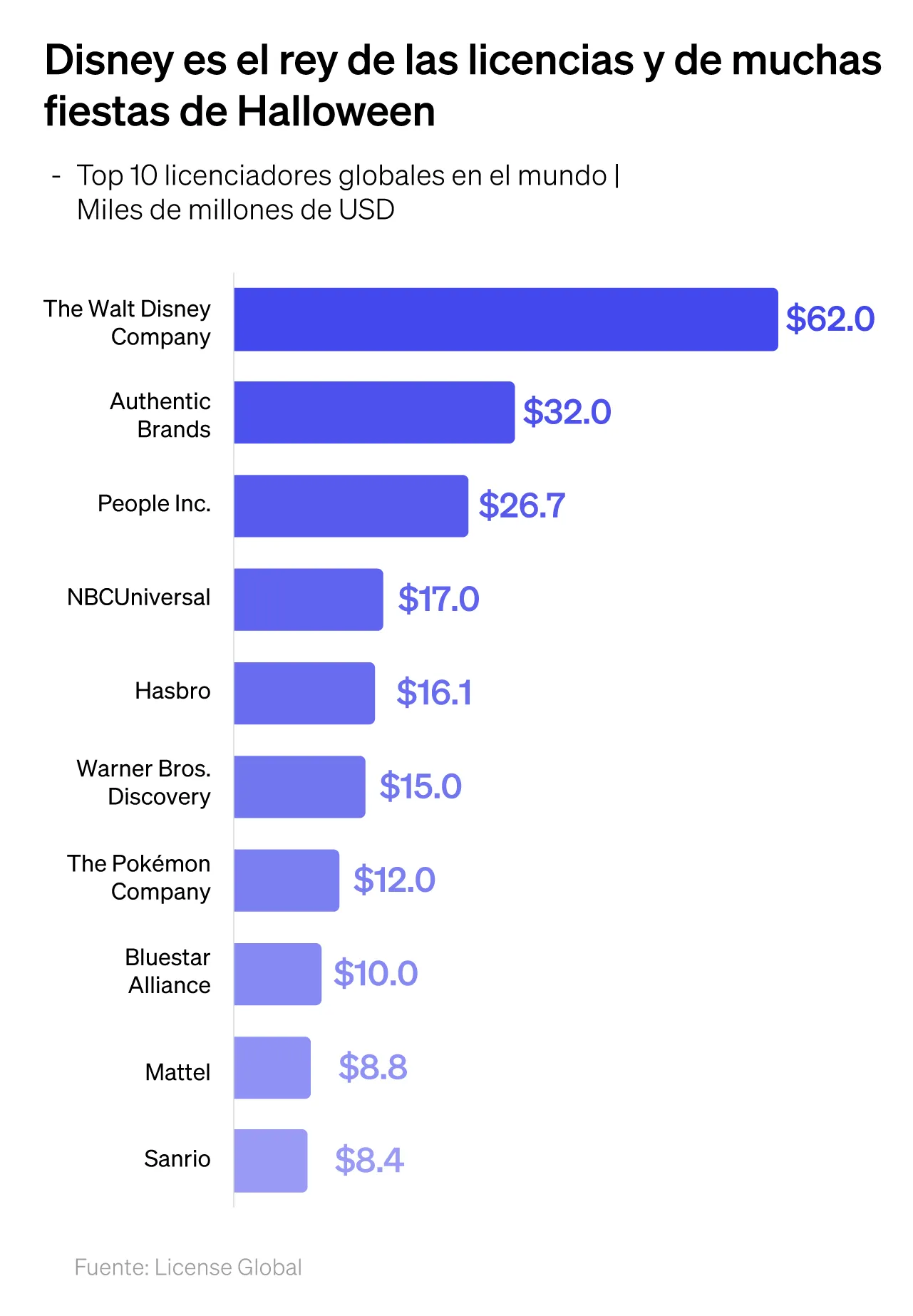 Entre las empresas que capitalizan este mercado está Spirit Halloween, una empresa privada que es hoy el mayor minorista estacional en Estados Unidos, con más de 1,400 tiendas. También destacan compañías que operan en segmentos satelitales: Amazon, por su dominio en e-commerce; Disney y otras firmas de entretenimiento, que otorgan licencias de personajes para disfraces; y marcas de juguetes que lanzan líneas temáticas cada año.