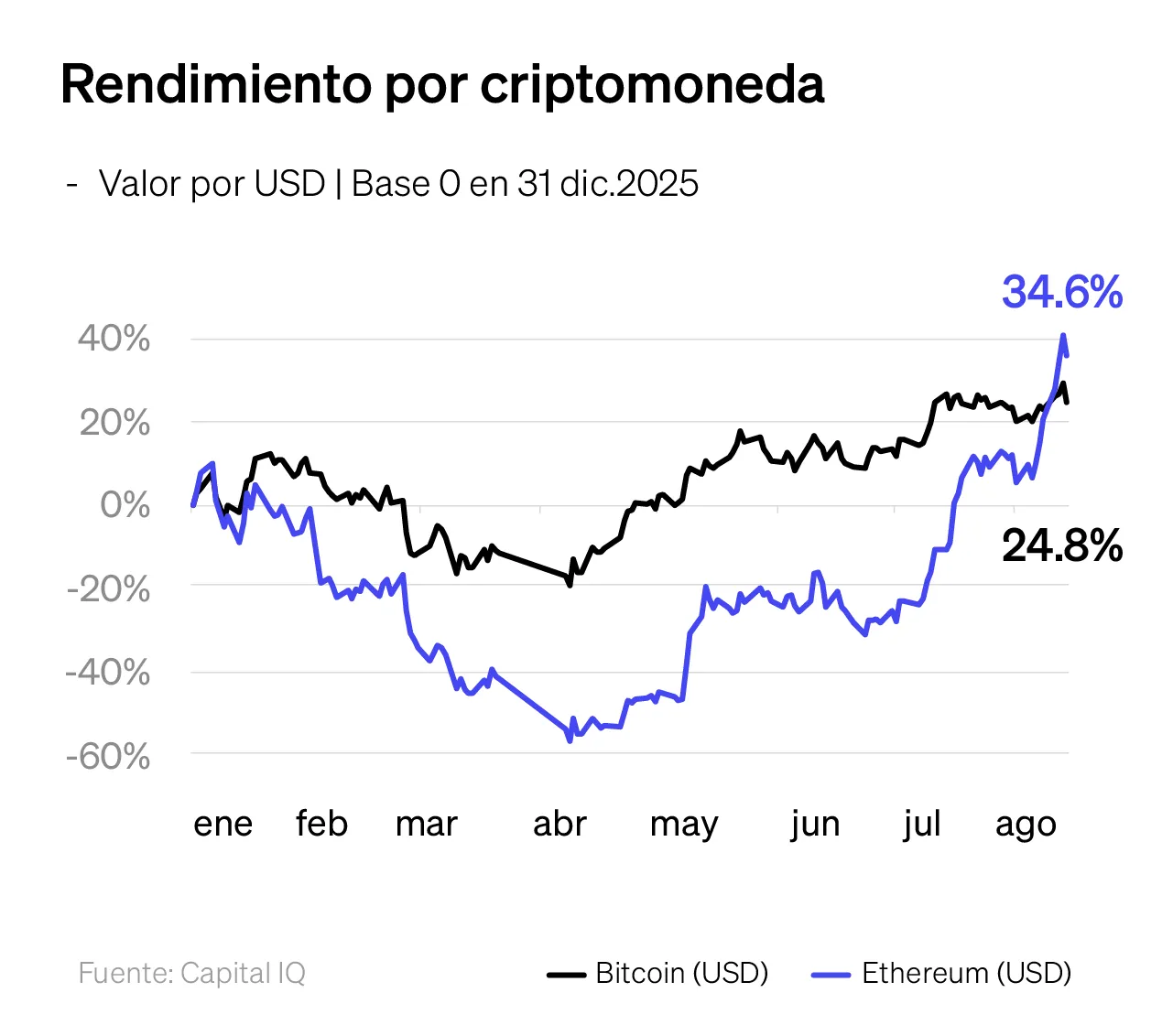 La diferencia también se puede vislumbrar en la forma en la que se ha adaptado en los negocios. Bitcoin generalmente es la puerta de entrada para inversionistas que buscan un activo escaso, relativamente predecible y con un ciclo de mercado un poco más influido por factores macroeconómicos. Ethereum, en cambio, atrae a empresas tecnológicas, gobiernos y desarrolladores que buscan una infraestructura probada para construir soluciones descentralizadas: desde mercados financieros y redes de videojuegos hasta sistemas de identidad digital y gestión de datos. En pocas palabras, mientras Bitcoin defiende la idea de un dinero libre de política, Ethereum busca reinventar las bases tecnológicas de internet.