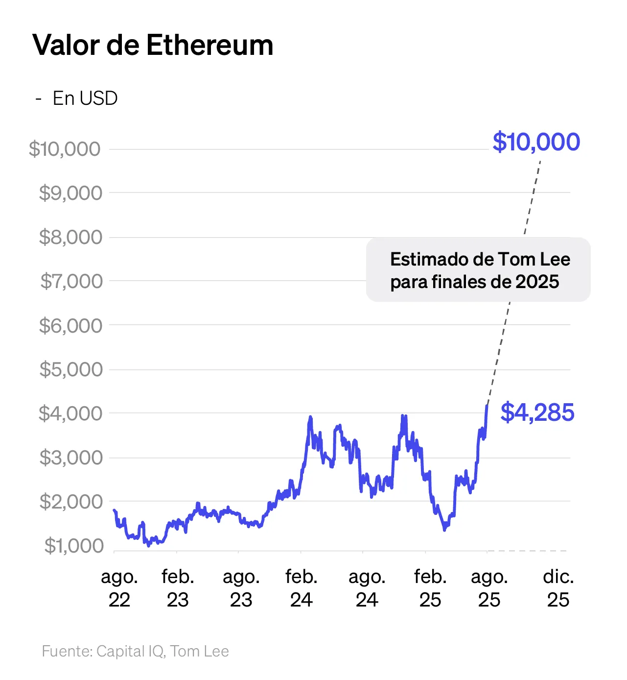 Algunos bancos, como Standard Chartered, estiman que ETH podría llegar a $7,500 dólares en 2025 y hasta $25,000 para el 2028. Además, el analista Miles Deutscher calcula que hay 27 mil millones de dólares listos para invertirse en ETH por parte de empresas, lo que equivaldría al 5% de todas las monedas en circulación y a un tercio de las que están disponibles en exchanges. Tom Lee, por su parte, cree que la moneda puede llegar a valer $10,000 dólares a final de 2025.