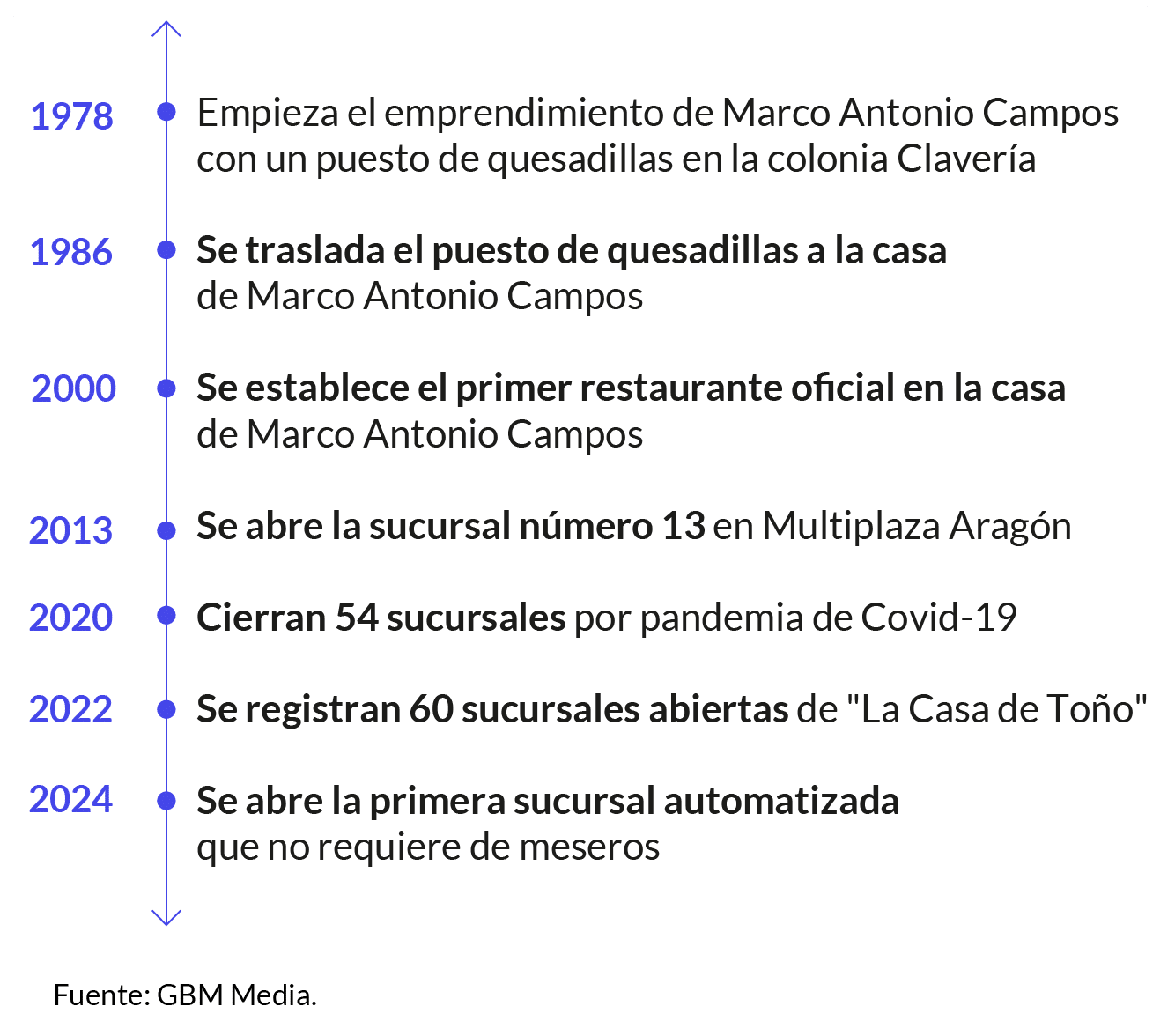 Quizá la pregunta más recurrente al hablar de esta cadena de restaurantes sea: ¿quién es Toño? Su nombre es Antonio Campos y decidió emprender un negocio de comida en 1978, cuando apenas tenía 18 años. Tiempo después, ese anafre banquetero se convirtió en una de las cadenas más populares de la Zona Metropolitana de la CDMX.
