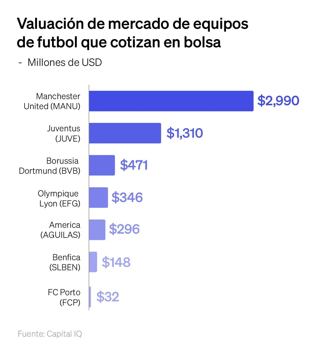 El mercado global de equipos de futbol públicos está dominado por instituciones europeas, con 25 clubes distribuidos en 13 países. Después de Manchester United, Juventus ($1.29B), Borussia Dortmund ($470M) y Olympique Lyon ($340M) completan el top 4 por capitalización de mercado. El fenómeno de clubes cotizados alcanzó su apogeo en los años 90, cuando 20 clubes ingleses cotizaban en la Bolsa de Londres, pero la mayoría se privatizó debido a la incompatibilidad entre objetivos deportivos y financieros.