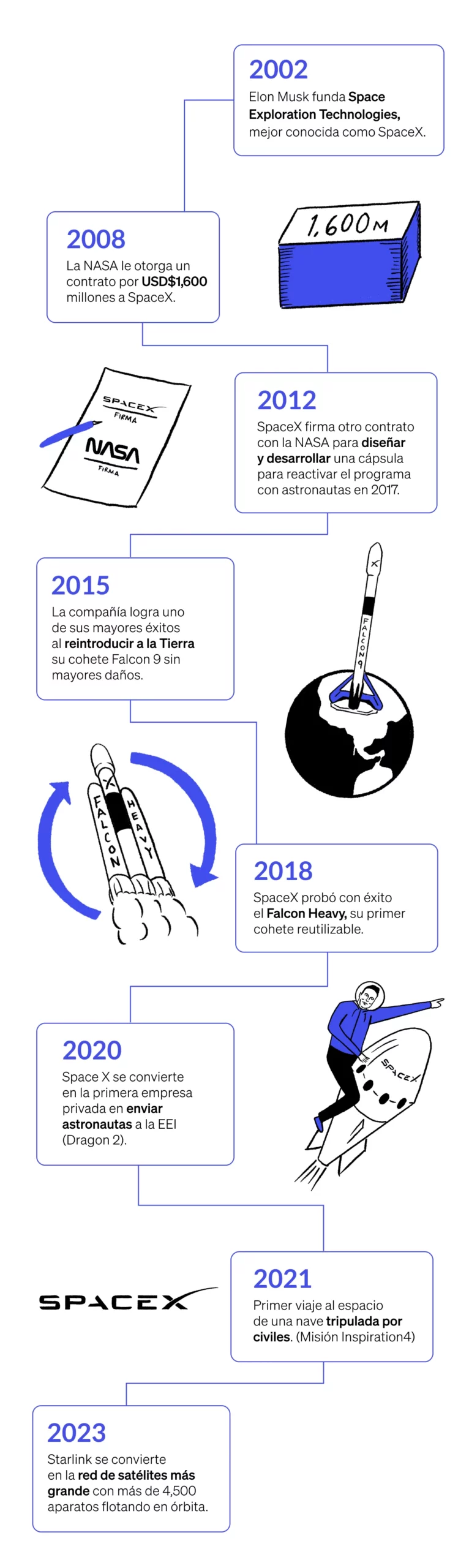 La compañía de Elon Musk logró realizar 98 lanzamientos espaciales el año pasado, lo que ayudó a que la empresa alcanzara una valuación de $175,000 millones de dólares. Del total de lanzamientos de la empresa de Musk, 62 se trataron de misiones para posicionar satélites de Starlink, la división de SpaceX enfocada en dar servicio de internet satelital de alta velocidad. Hasta octubre de 2023, había más de 4,500 satélites de Starlink flotando en la órbita baja de la Tierra, lo que la hace la red más grande de satélites de banda ancha del mundo. Aún así, la marca se ha quedado corta en sus pronósticos de llegar a 20 millones de usuarios en 2022, pues apenas han alcanzado el millón de clientes.