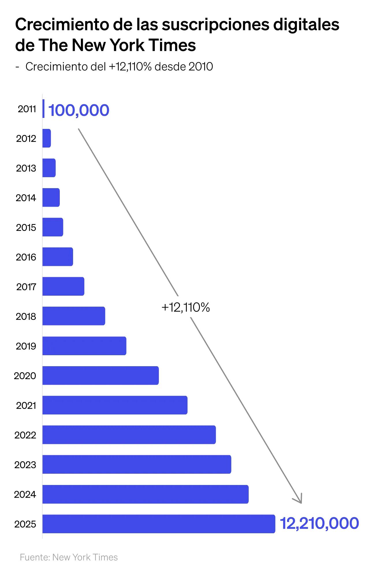 El New York Times supera los 12 millones de suscriptores, con cerca del 90% digitales, y hoy obtiene alrededor del 65% de sus ingresos de suscripciones, reduciendo de forma estructural su dependencia de la publicidad.