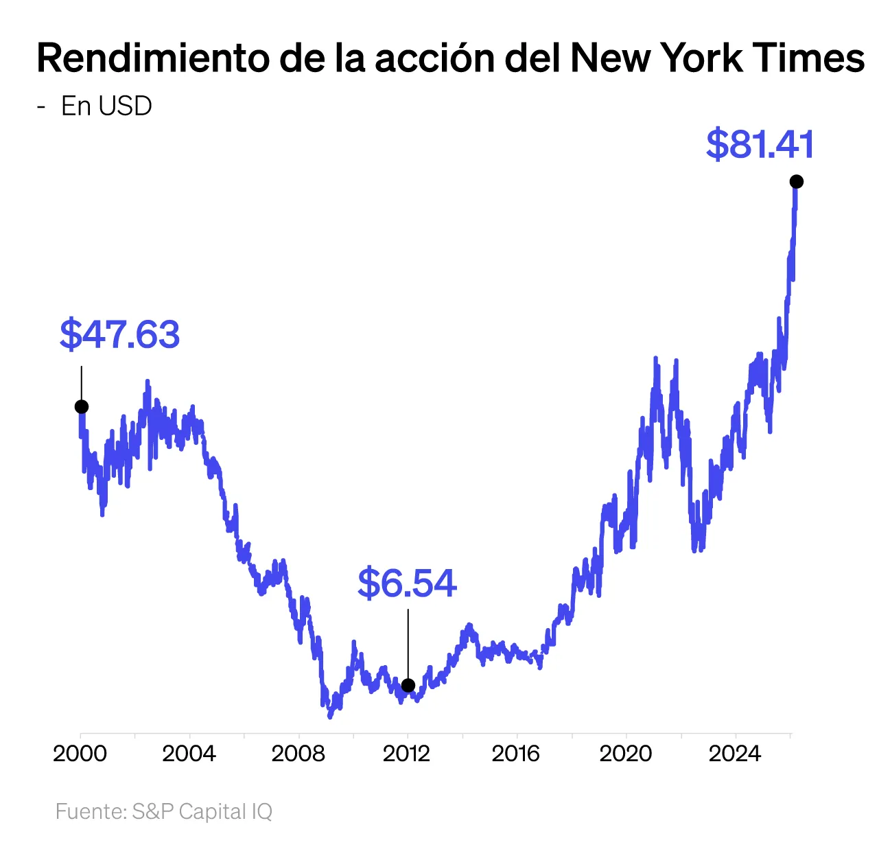 Las acciones del New York Times cotizan en la Bolsa de Nueva York bajo el ticker NYT. La acción alcanzó su máximo histórico el 5 de marzo de 2026, tocando los $81.41 , lo que refleja cómo el mercado ha revaluado al Times: de empresa de medios en declive a negocio de suscripciones con crecimiento predecible.