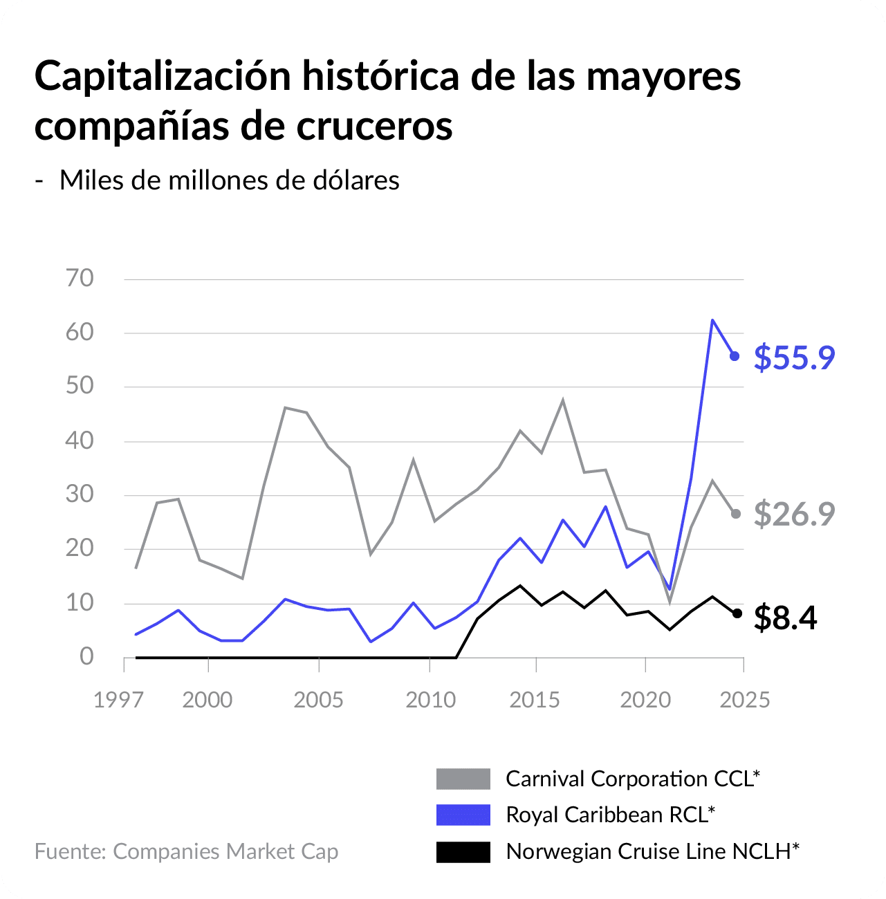 Esta clase de barcos no sólo redefine el lujo y el entretenimiento a bordo, sino que también representa el estandarte tecnológico y operativo de toda la industria. El mercado de inversionistas ha reconocido a Royal Caribbean, con el ticker RCL*, como la compañía con mejores perspectivas de crecimiento, lo cual se ha reflejado en su capitalización histórica de mercado.
