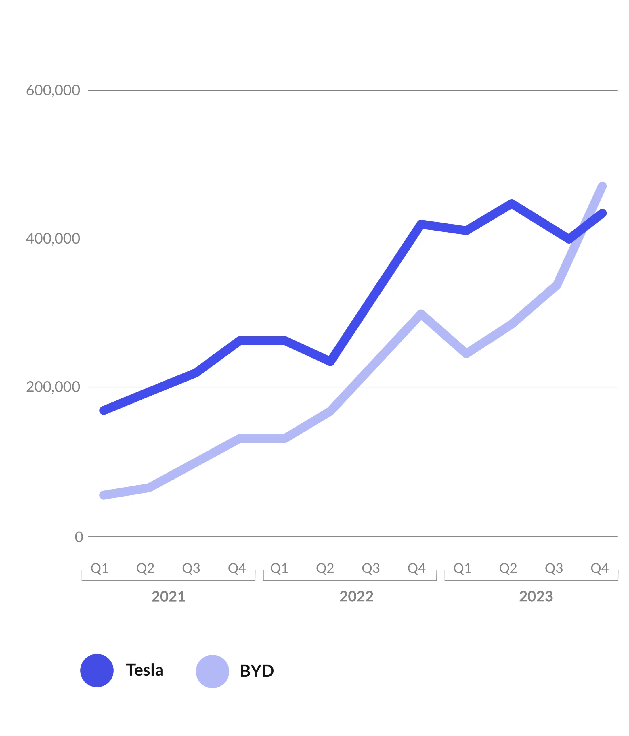 Eso sí, el gran milestone de BYD llegó en el cuarto trimestre del año pasado, cuando superó por primera vez a Tesla como el mayor vendedor de autos eléctricos (BEV) a nivel mundial.